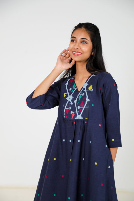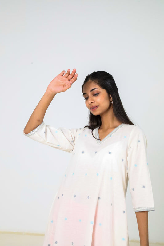 The kurta falls beautifully and is the perfect length. Great to wear to work and comes with pockets which is always welcome!