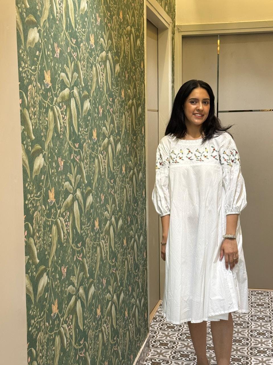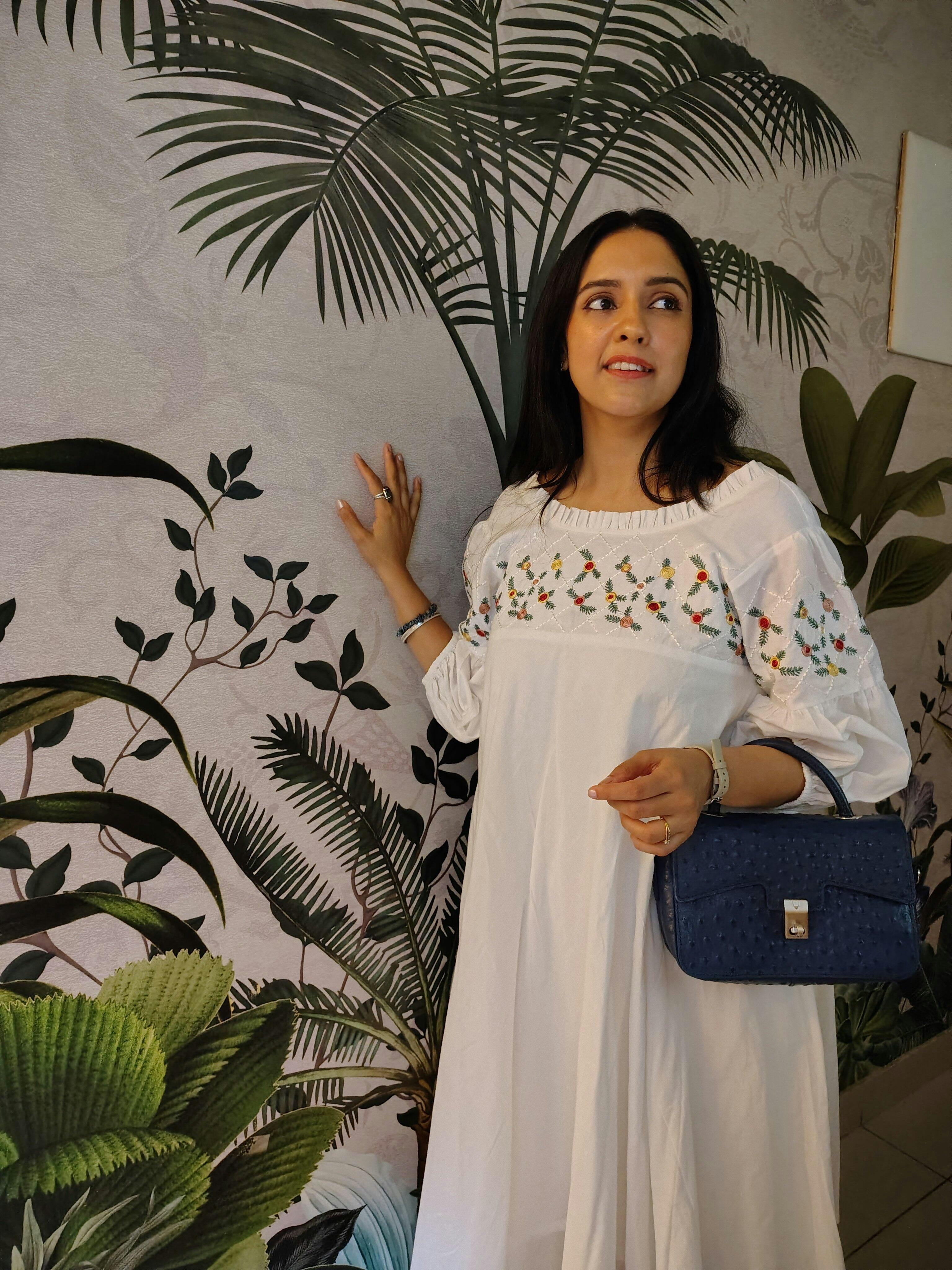 This relaxed fitย A-line dress is made from cotton that gently drapes the body, featuring soothing embroidery on the yoke and on the sleeves with little gathers on the sleeves adding to the drama will make you feel younger and beautiful.