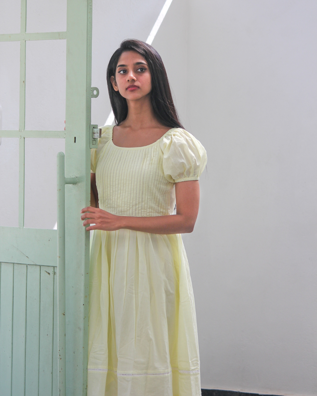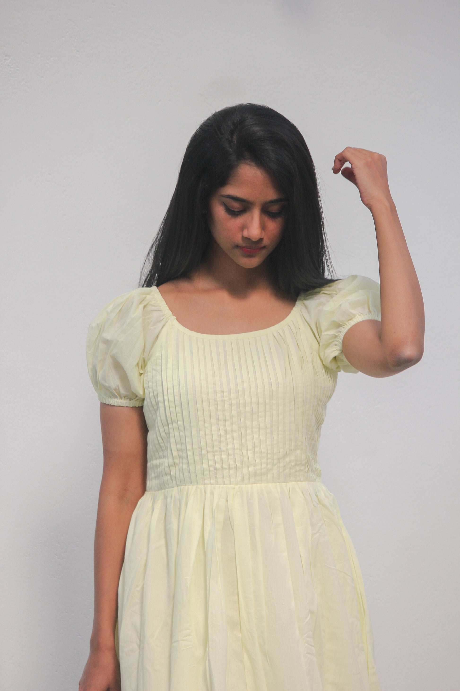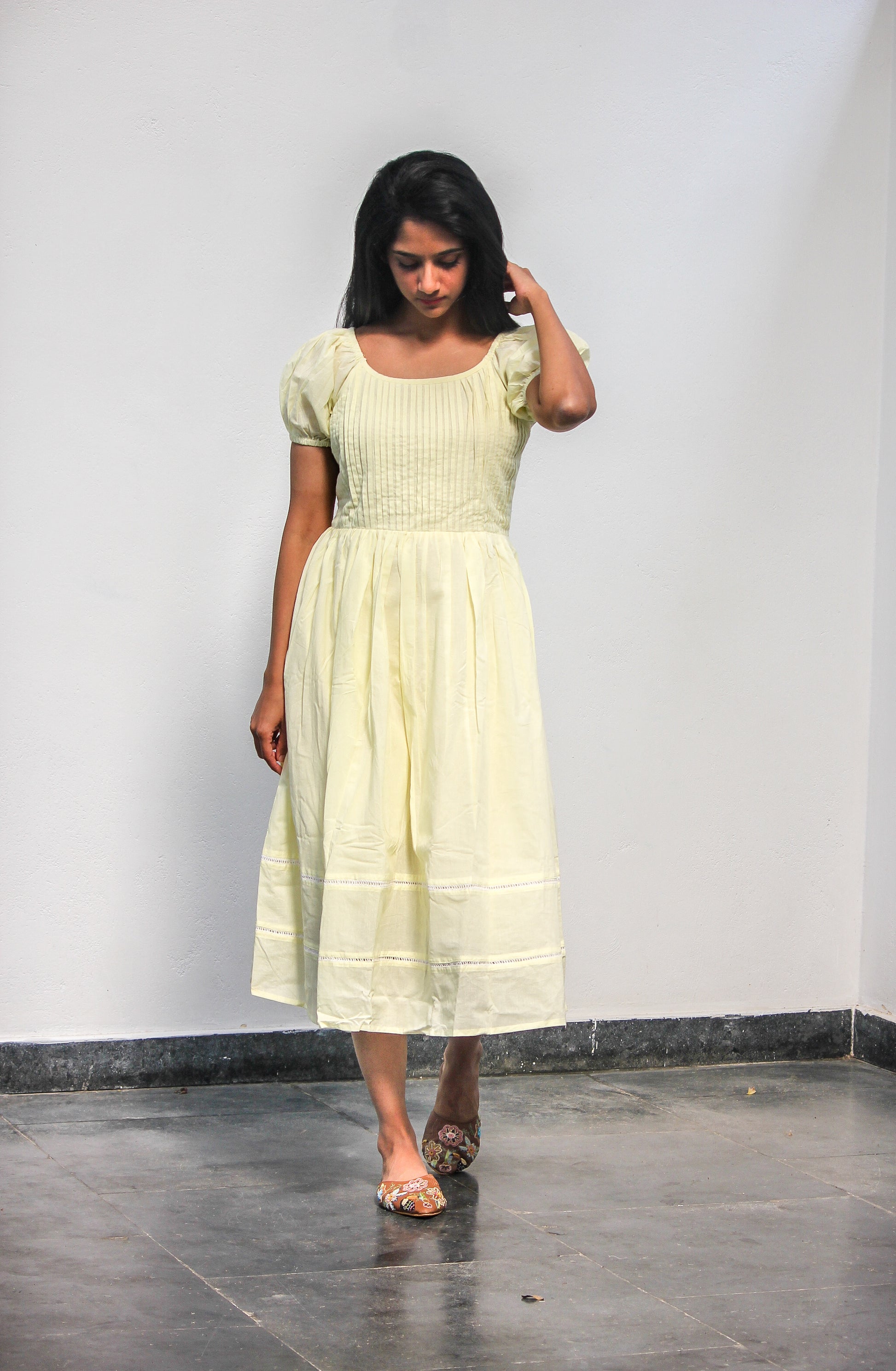 Solid pastel yellow breathable cotton fabric brought to life in its perfect mood with pintuck yoke and elasticated sleeves and shoulder with lace details on the skirt is mood enhancers on gloomy winter days.