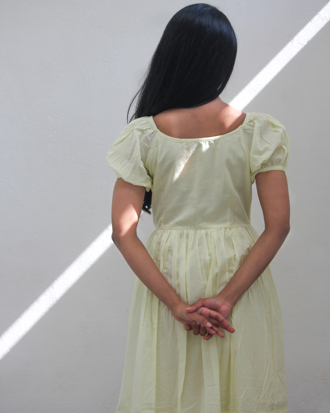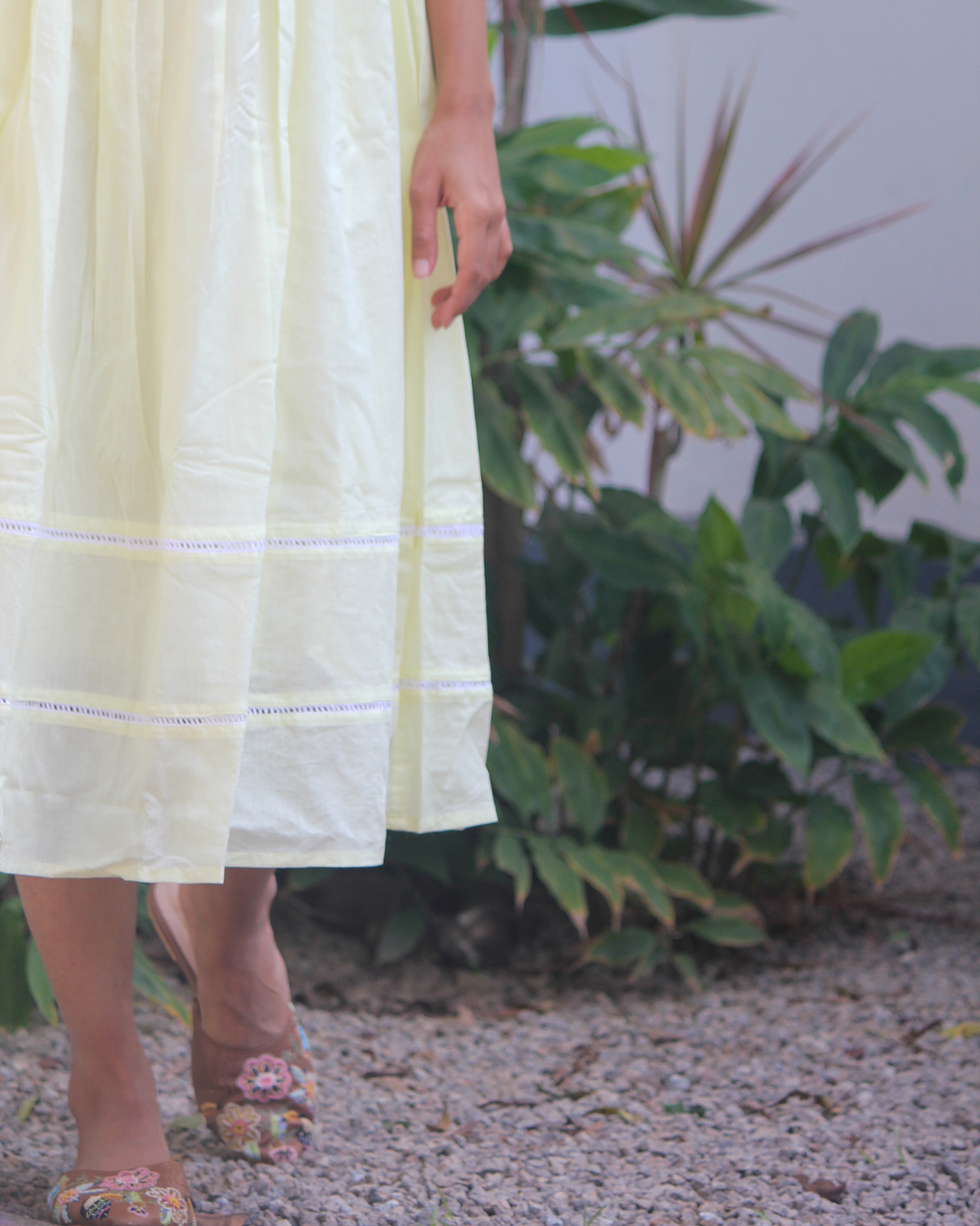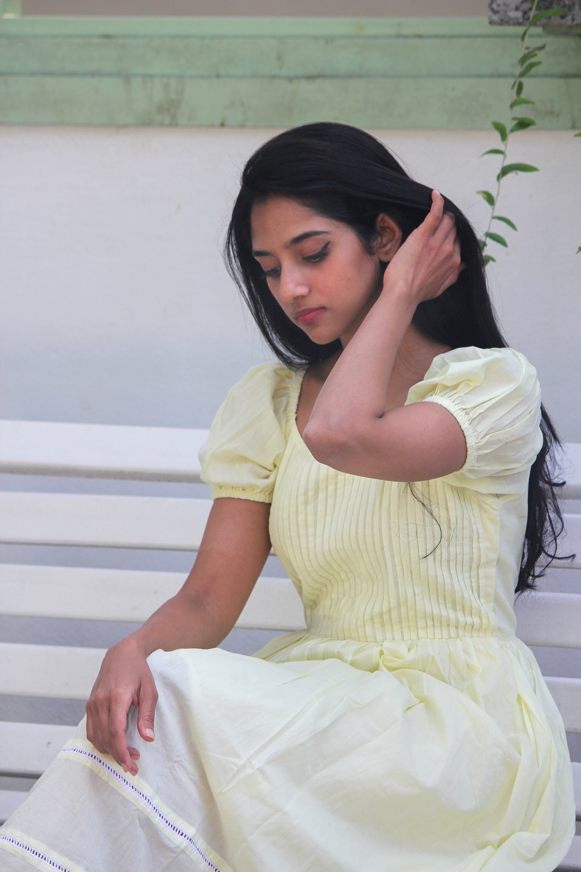 Solid pastel yellow breathable cotton fabric brought to life in its perfect mood with pintuck yoke and elasticated sleeves and shoulder with lace details on the skirt is mood enhancers on gloomy winter days.