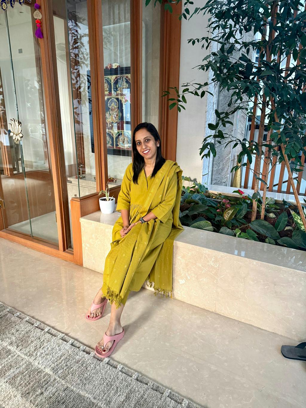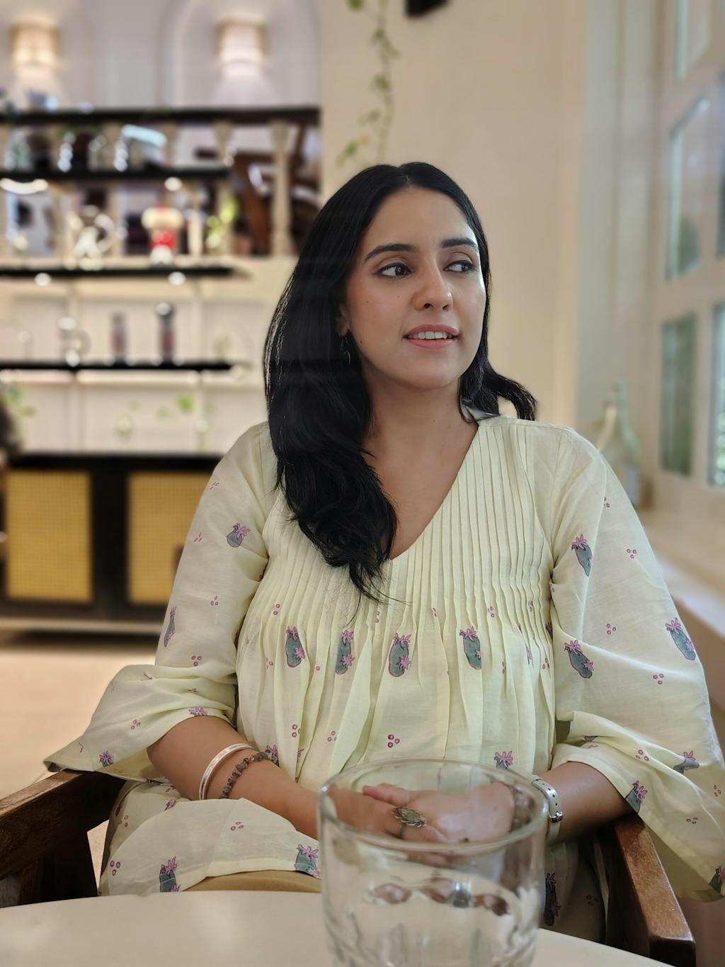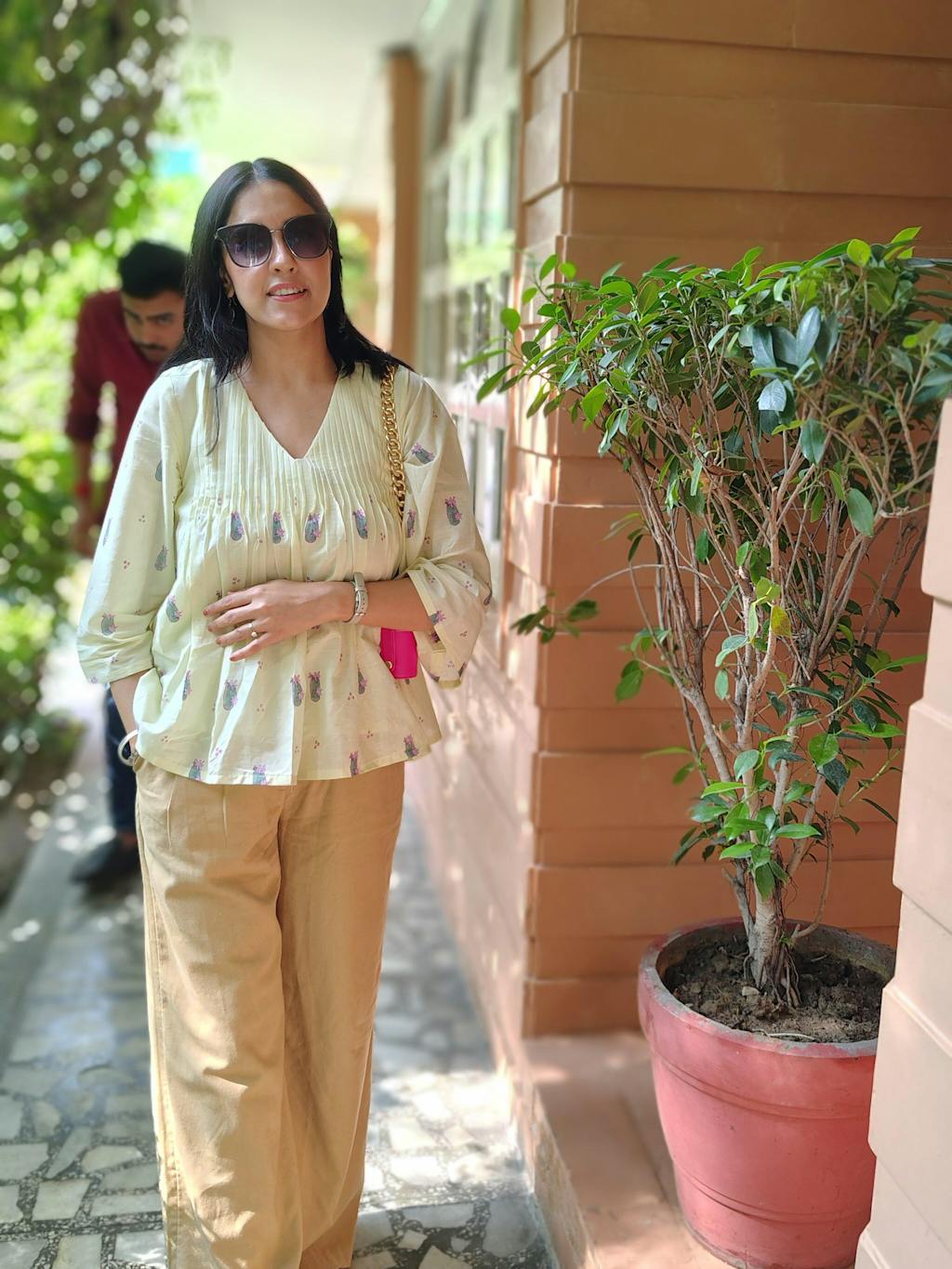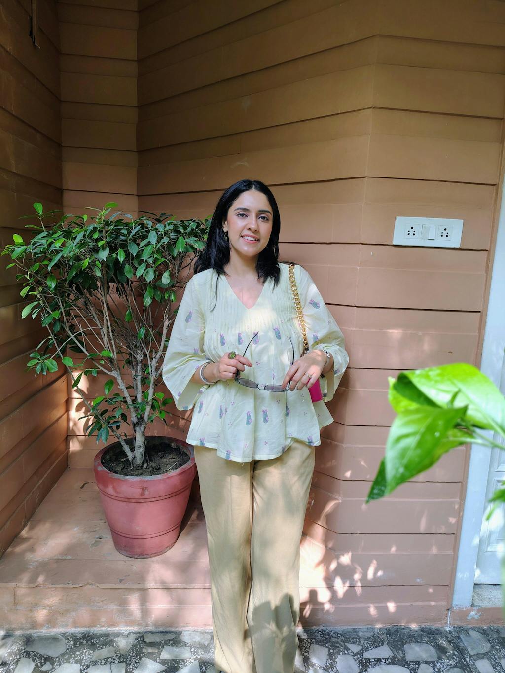 The Calla Lily Kurta Set comes in a soft mauve tone with a round neckline finished with a gentle V at the centre. The flowy A-line shape pairs beautifully with yellow striped pants for a lively yet balanced look.
