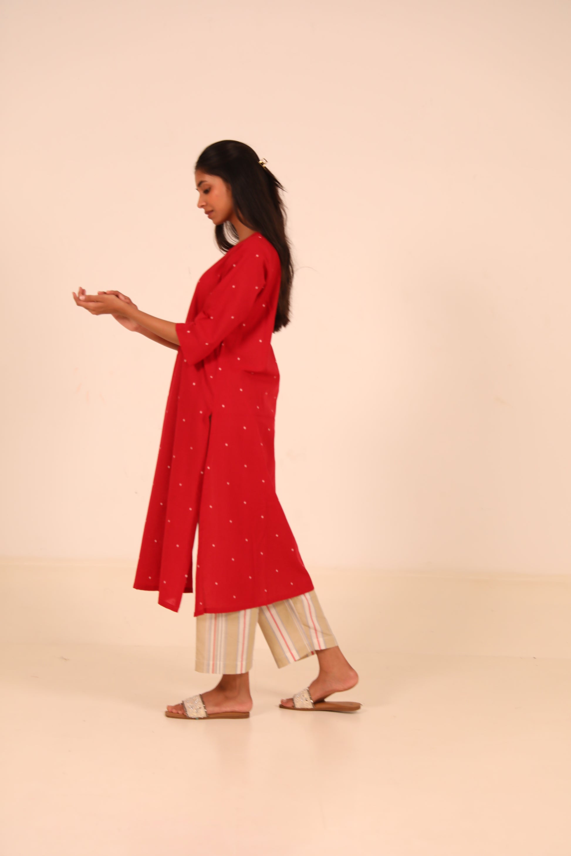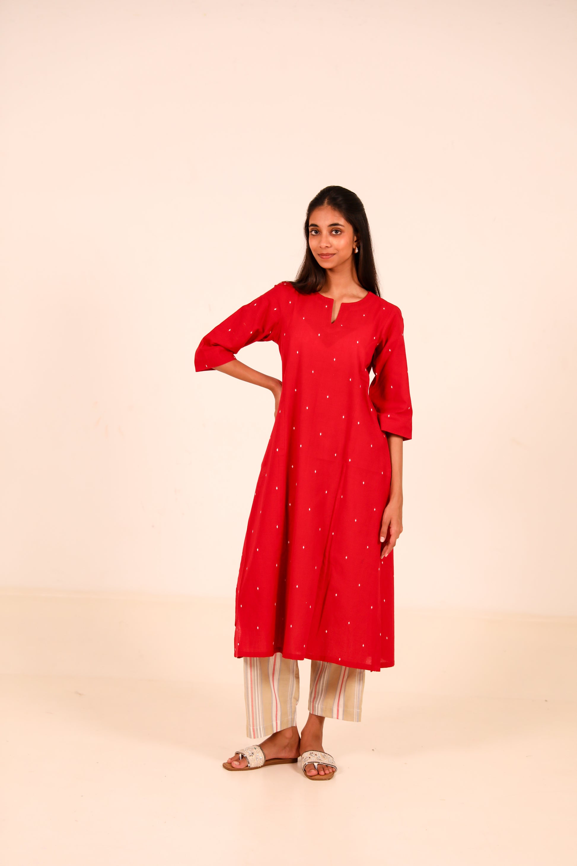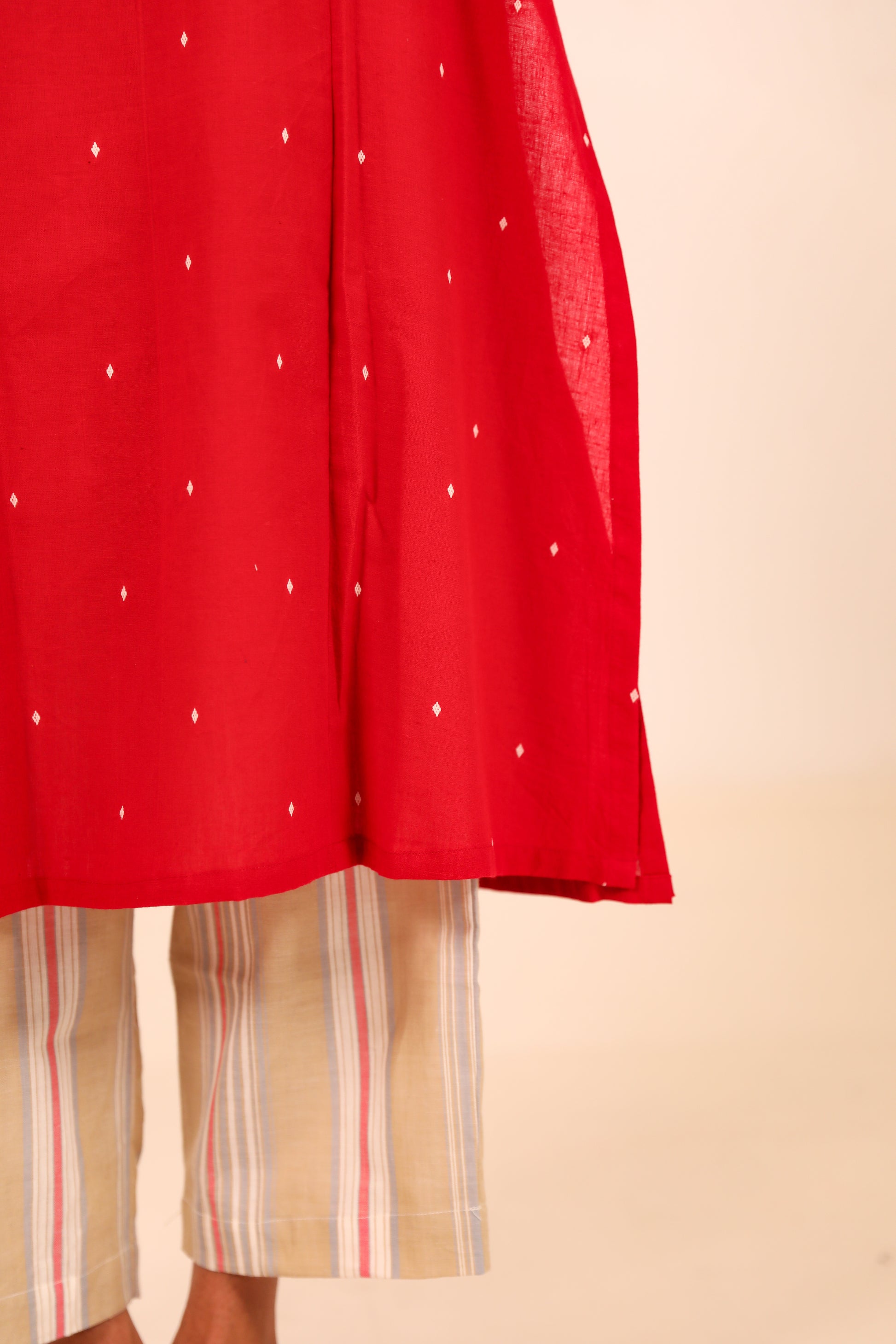 Turn up the spice in our rich red Chili Oil kurta set. With crisp tailoring, soft cotton fabric, and a statement hue, it’s a wardrobe standout.