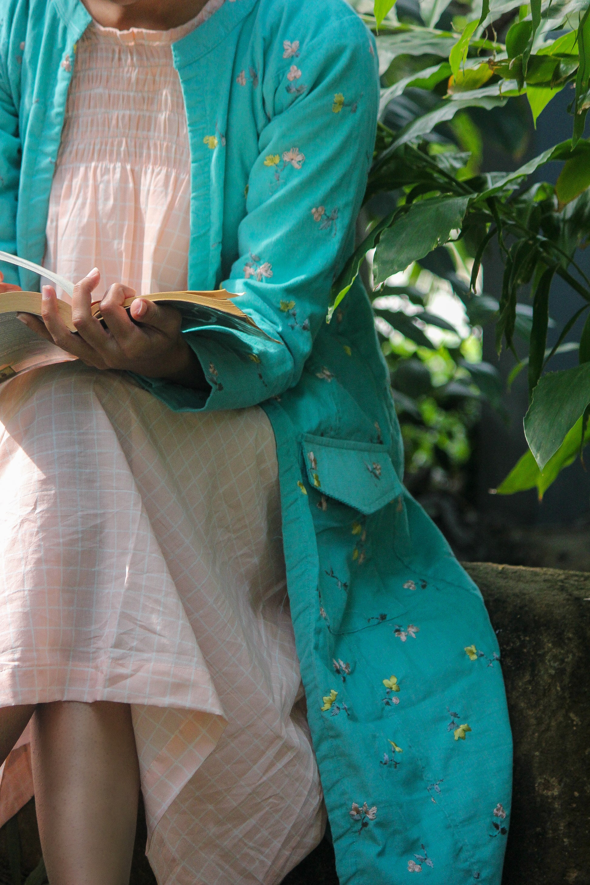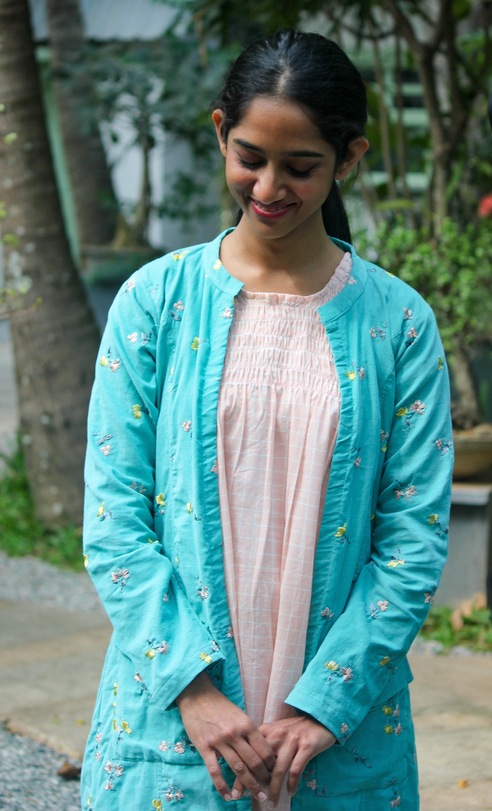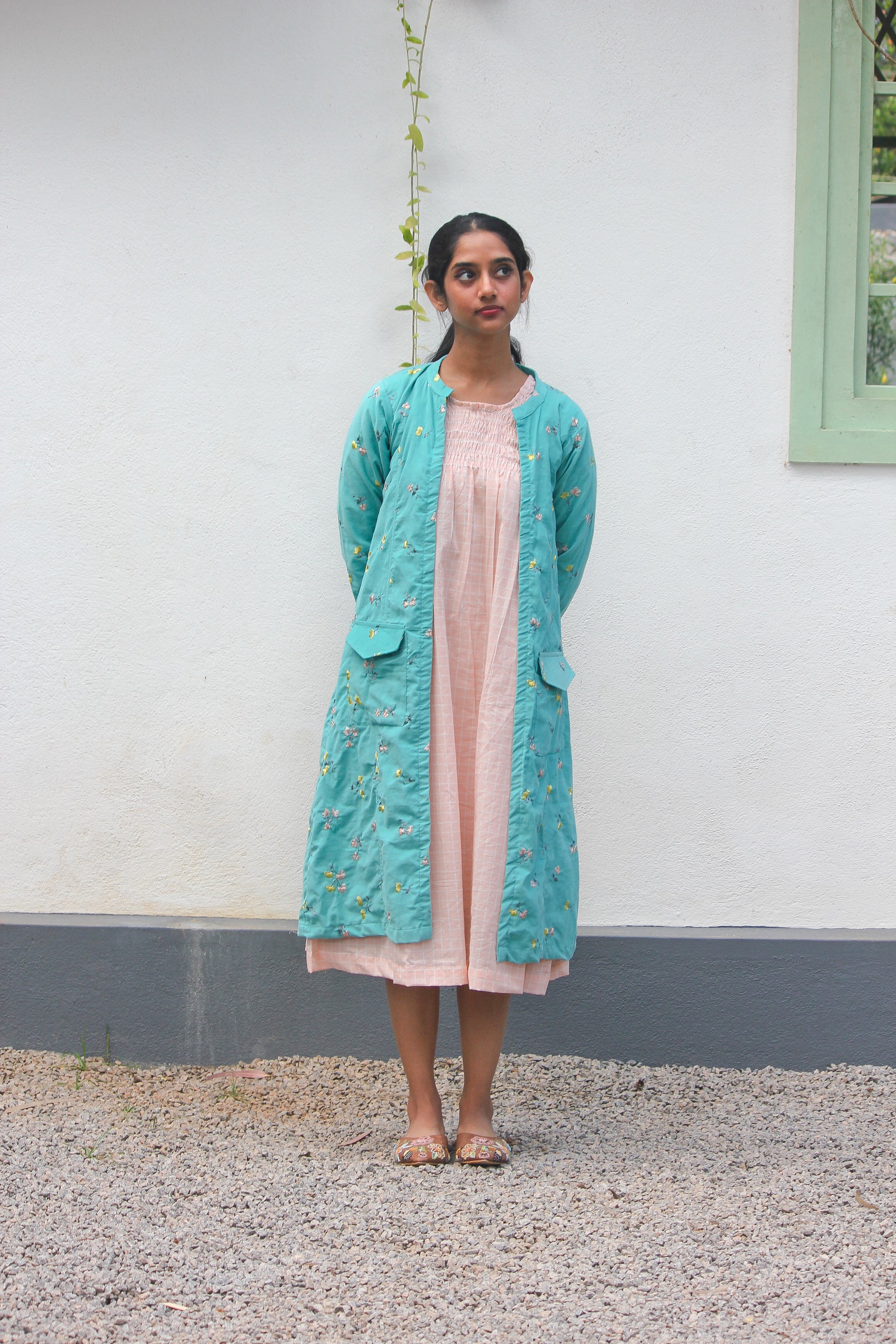 - The model is wearing this coat with our Peach Parrot Smock Dress.