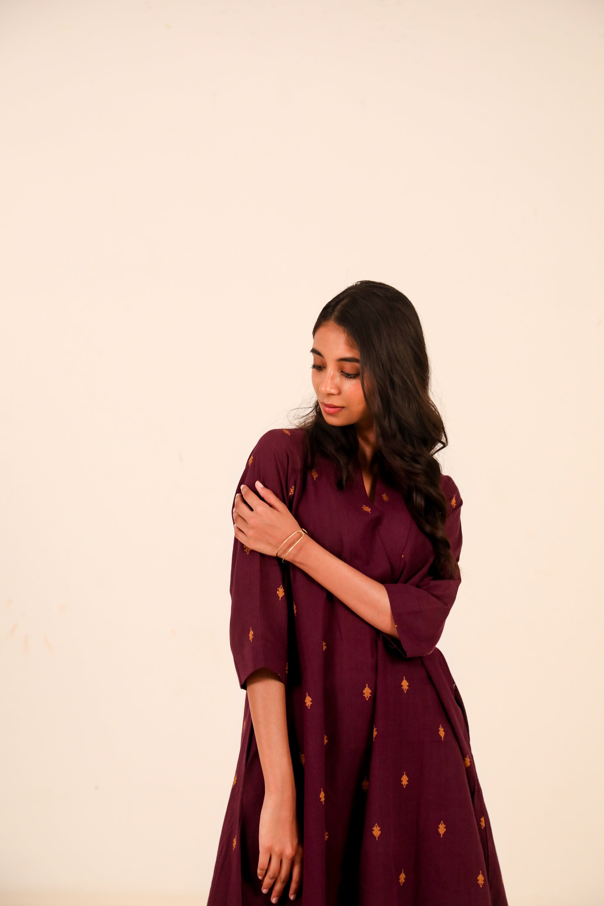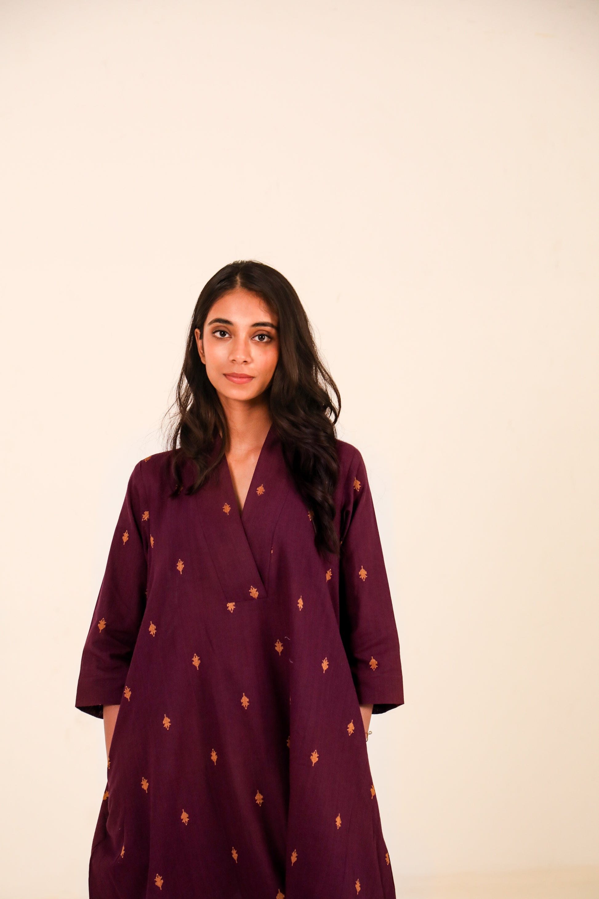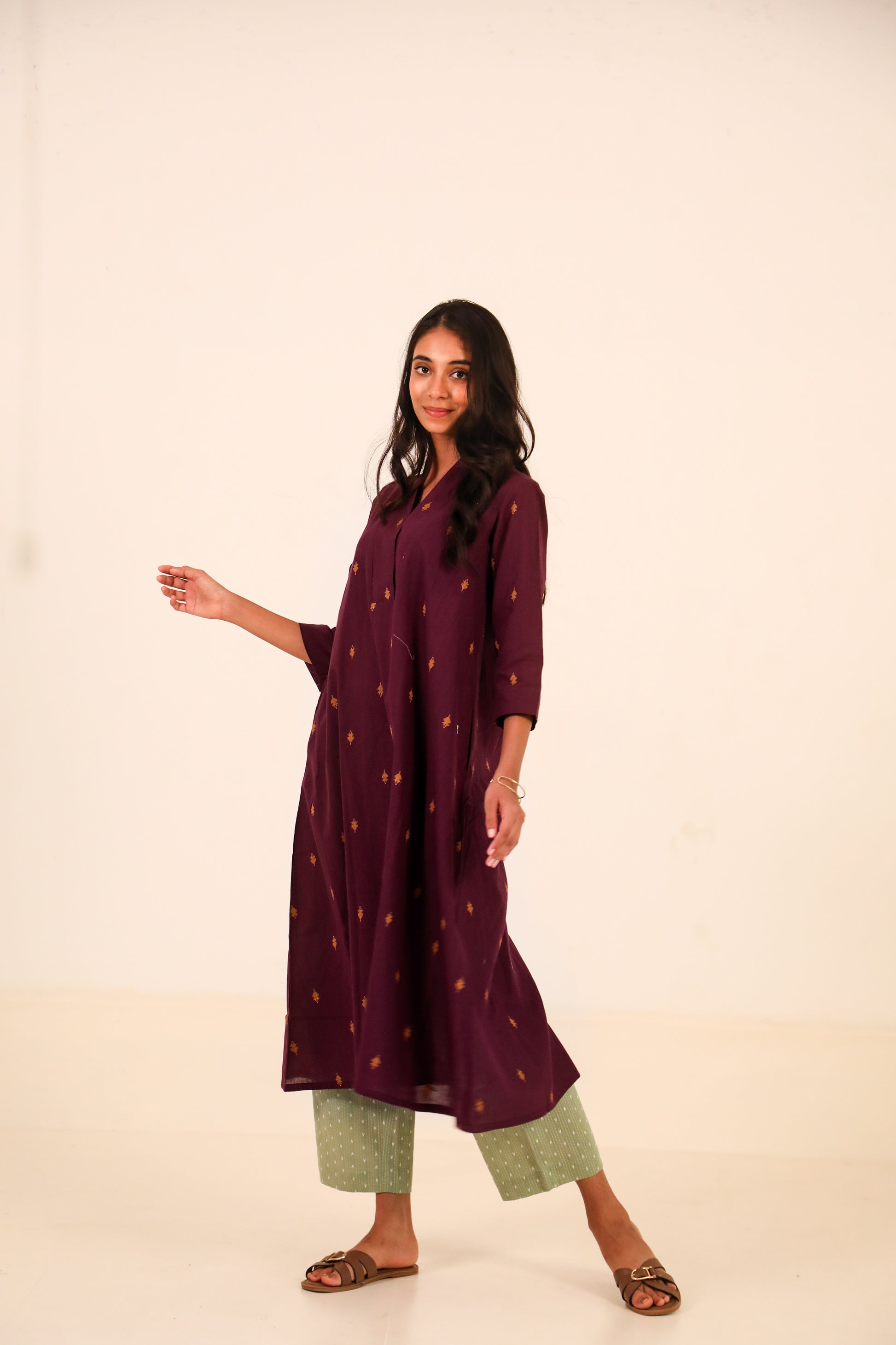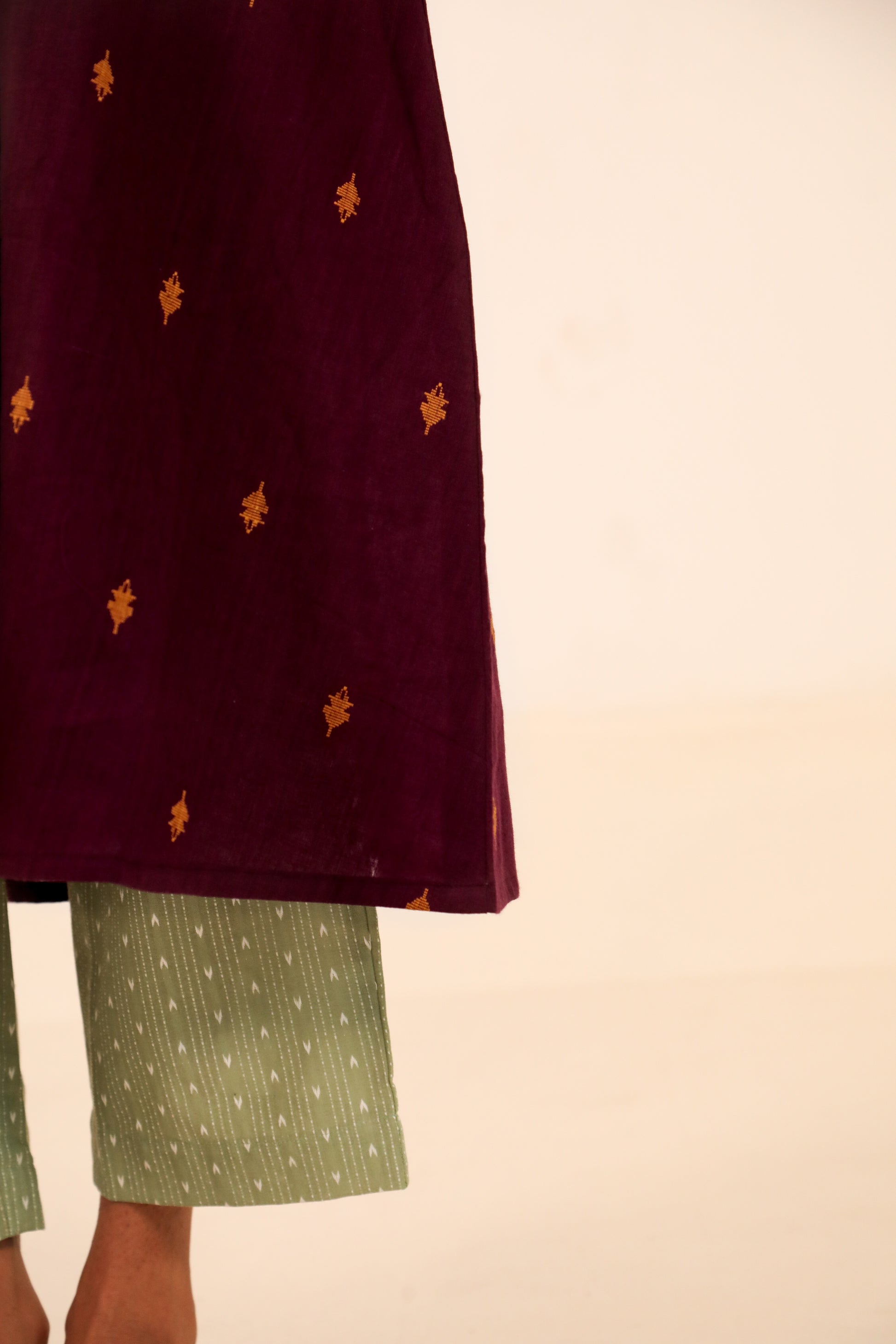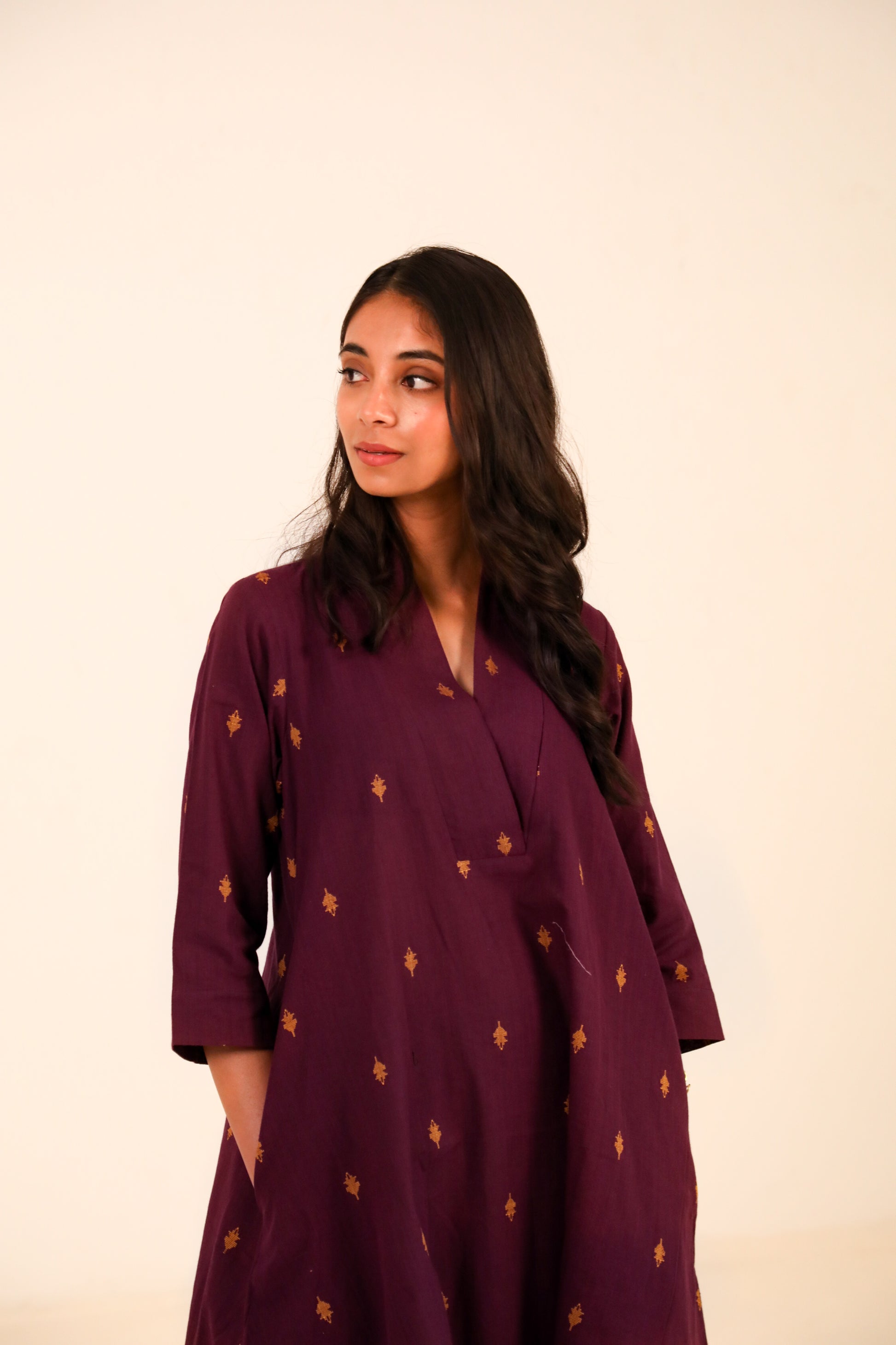 Effortlessly elegant and rooted in comfort, this kurta set is perfect for your everyday moments. Marsala kurta in deep wine colour features delicate woven motifs in earthy mustard tones, crafted on soft, breathable cotton. Designed in a relaxed A-line silhouette with a V-neck and 3/4th sleeves, it flatters all body types while allowing easy movement.
