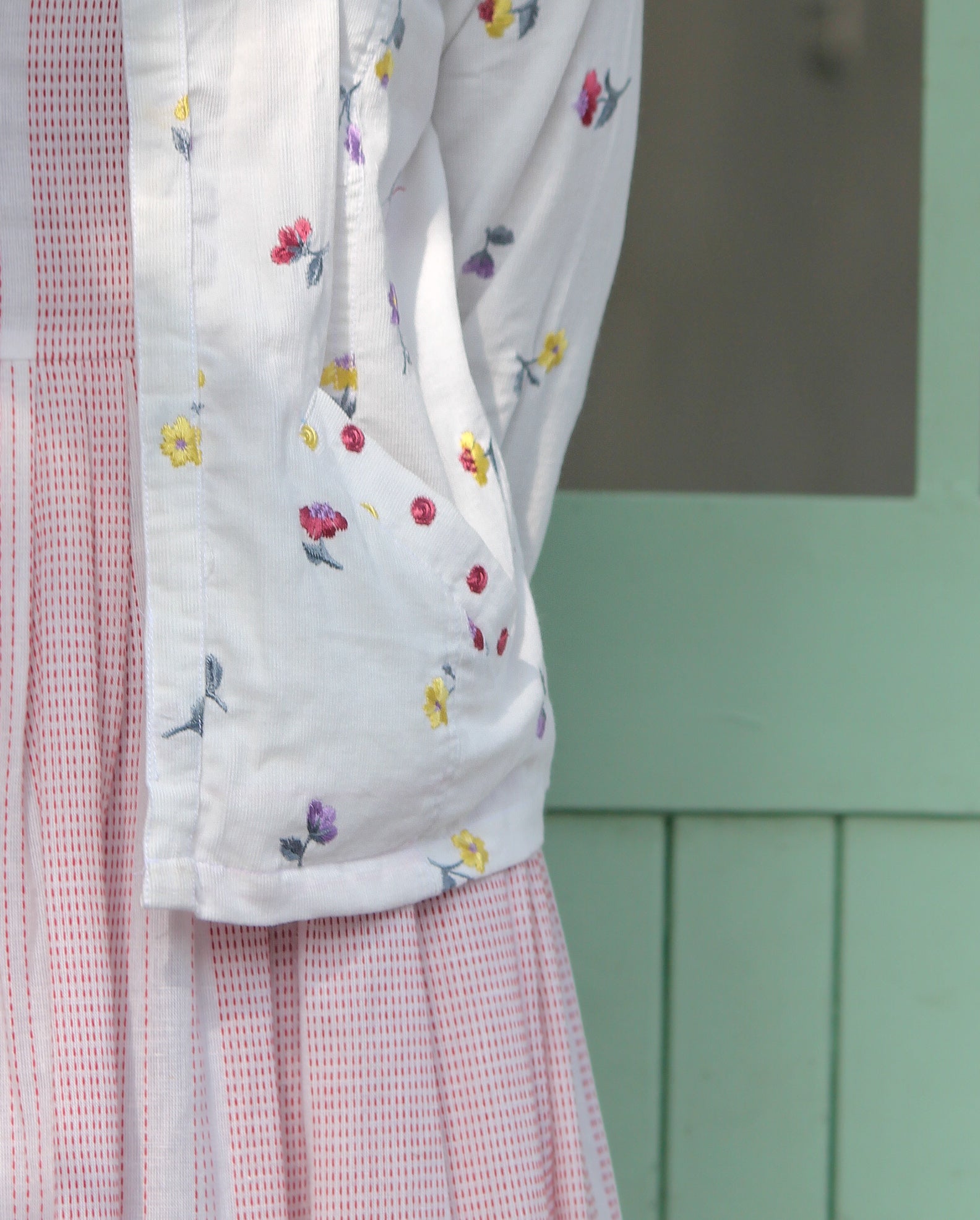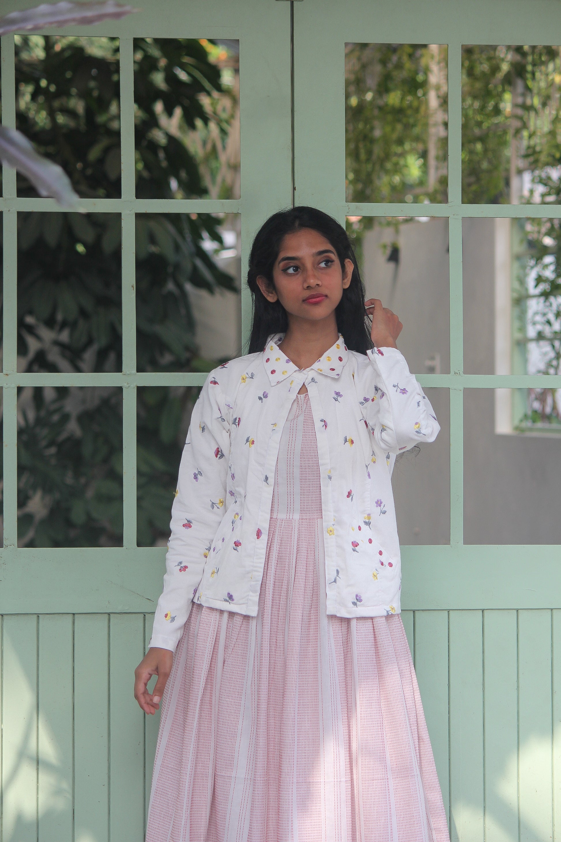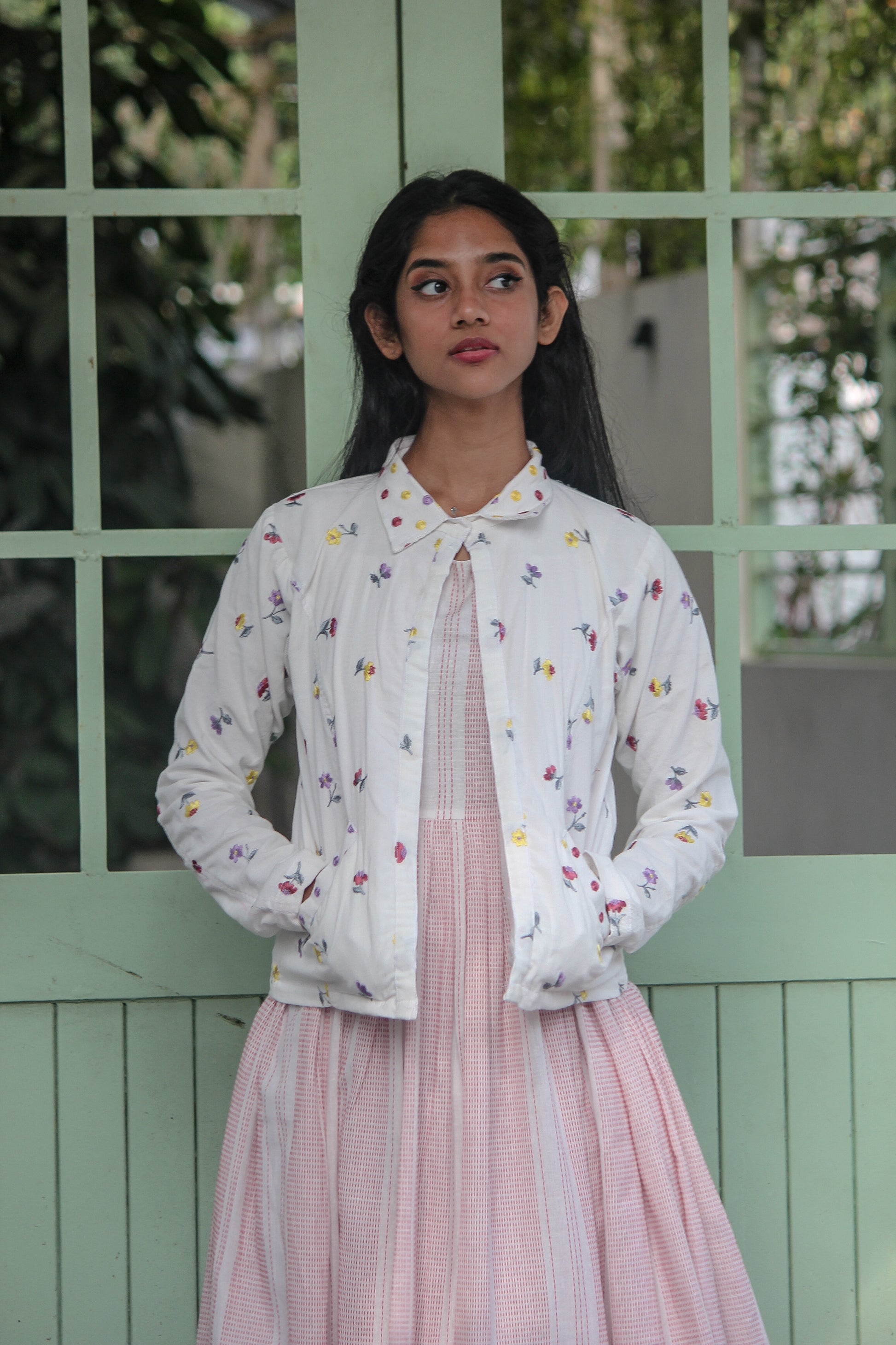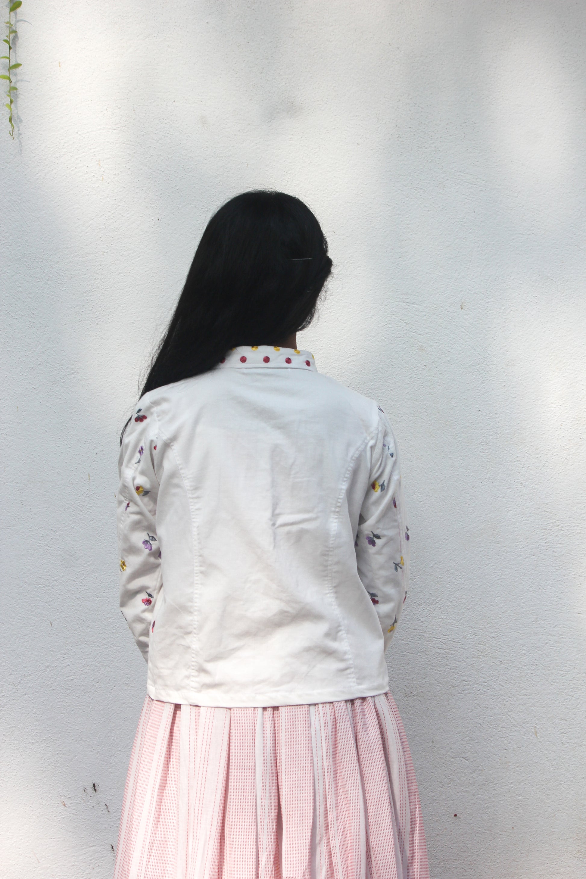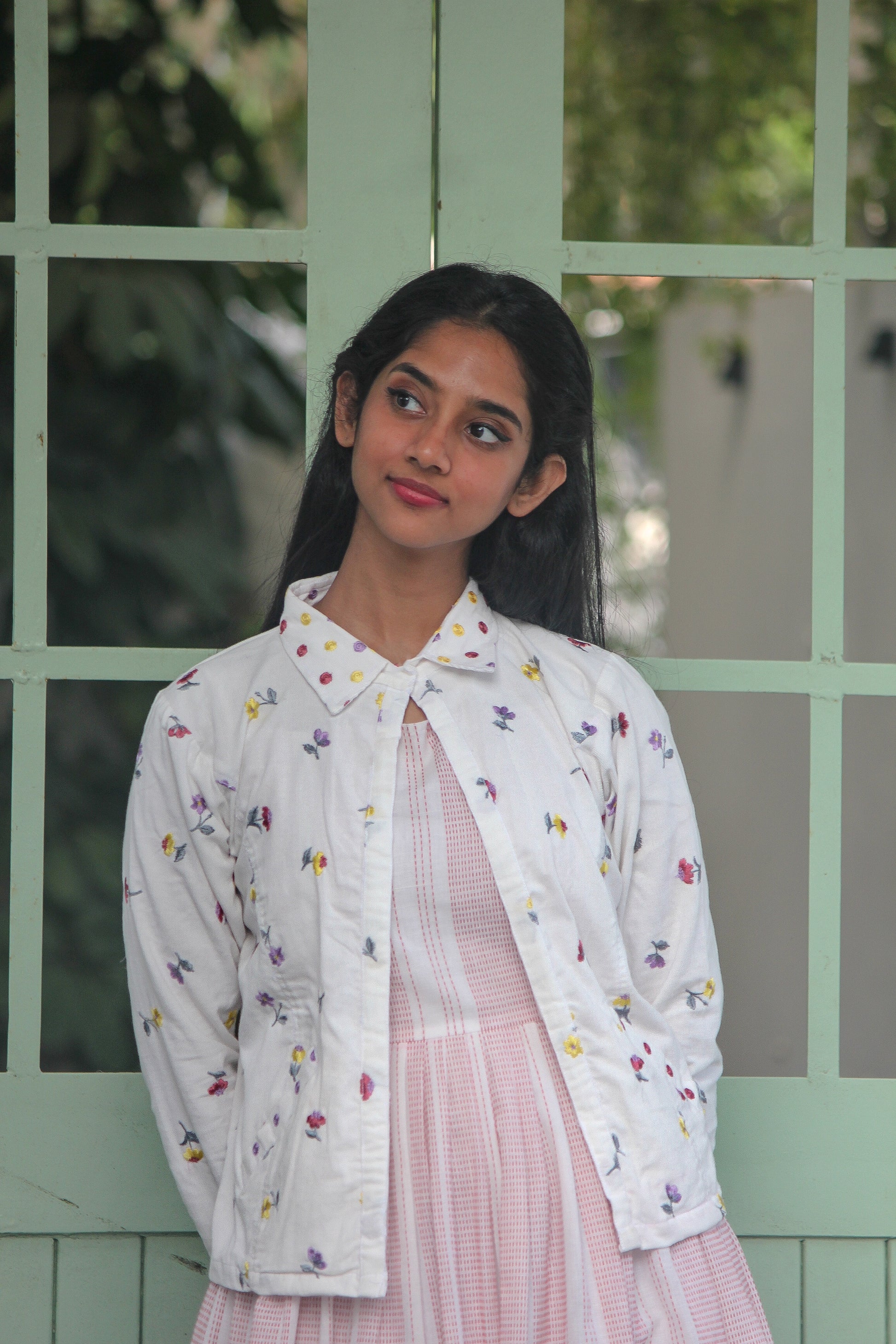Made to fall in love with comfort and feel cozy, our Marshmallow Garden Corduroy Jacket is your best friend this winter which has perfect blend of Polka dot embroidery on the collar and the pockets with floral embroidery.