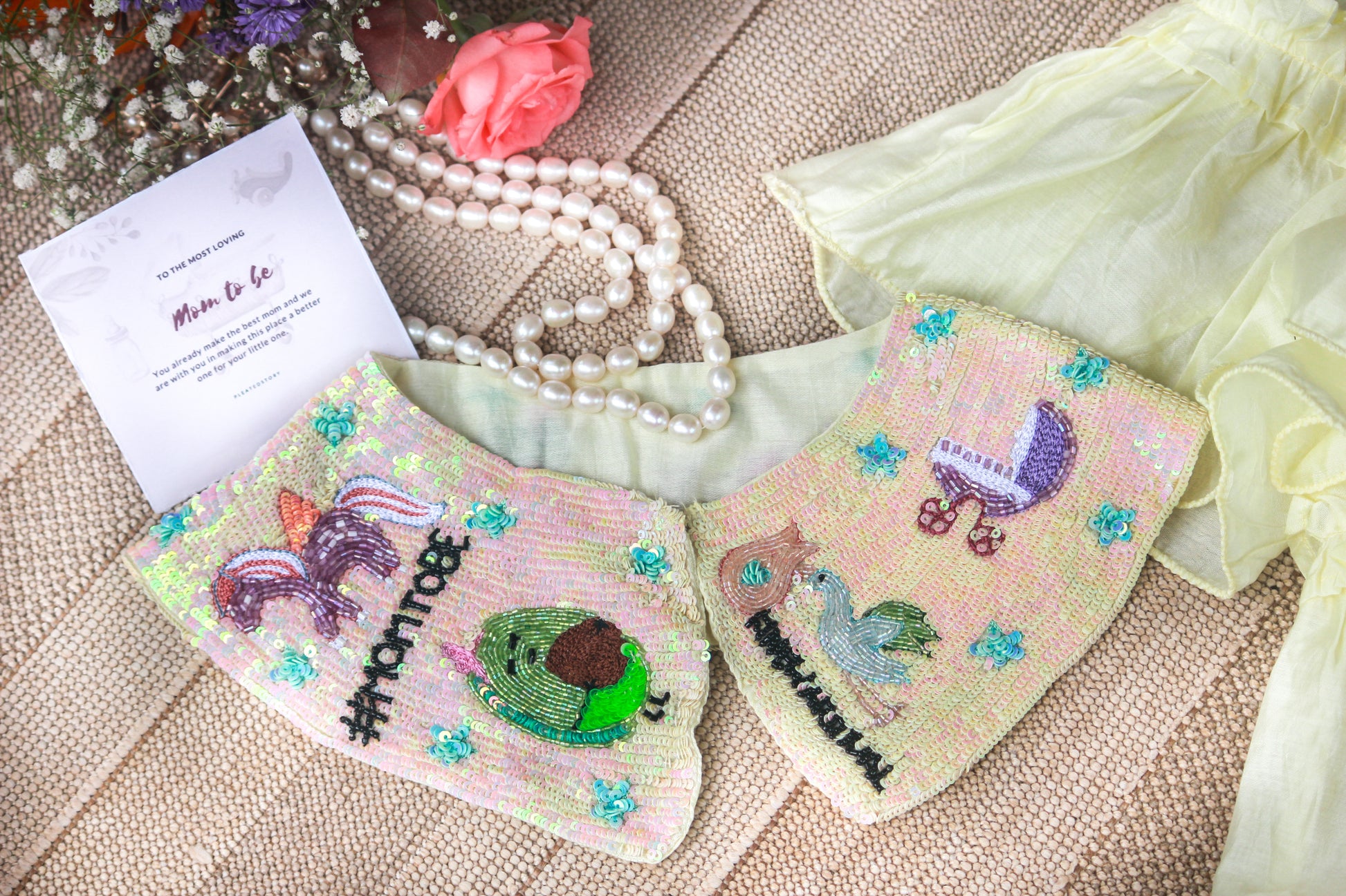 There's no better happiness than to be a mom. The journey of a mother starts from the moment the tiny little one starts growing inside her womb and we want everything beautiful, nice and cute as she embraces the journey she will forever cherish. Made with lot of love our mom to be box contains beautifully handcrafted detachable collar with hamd embroideredΒ details of elements of motherhood.Β