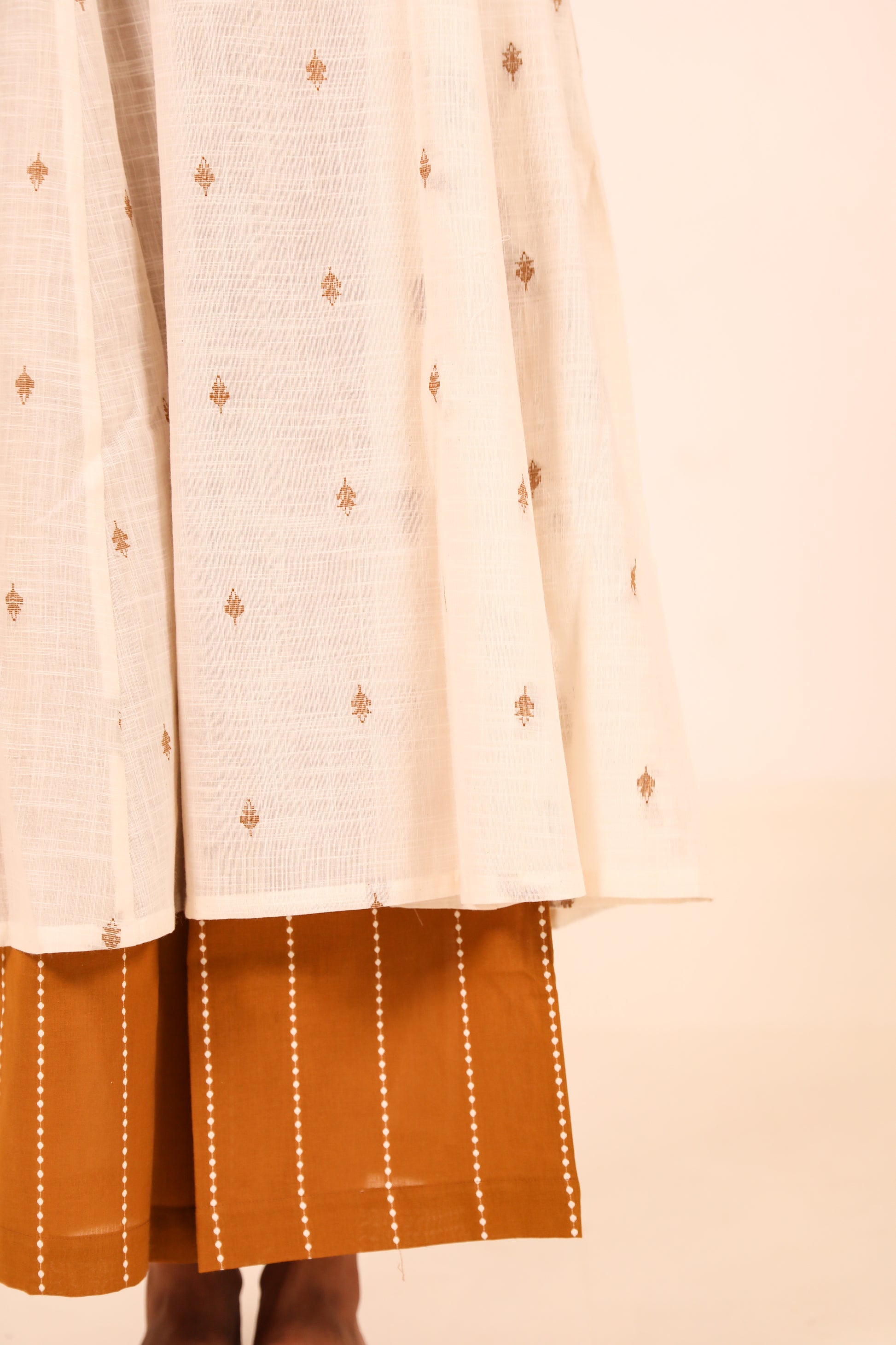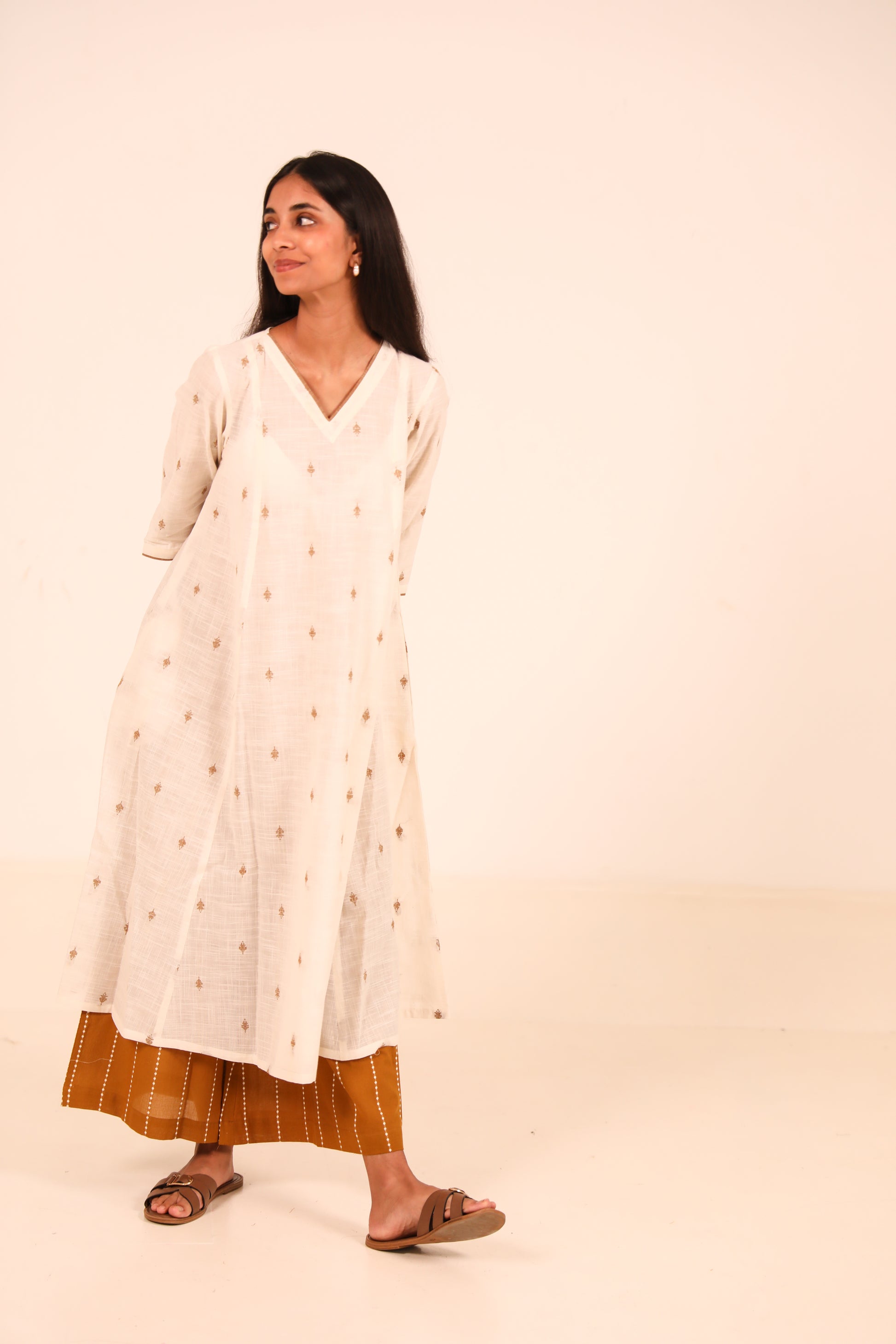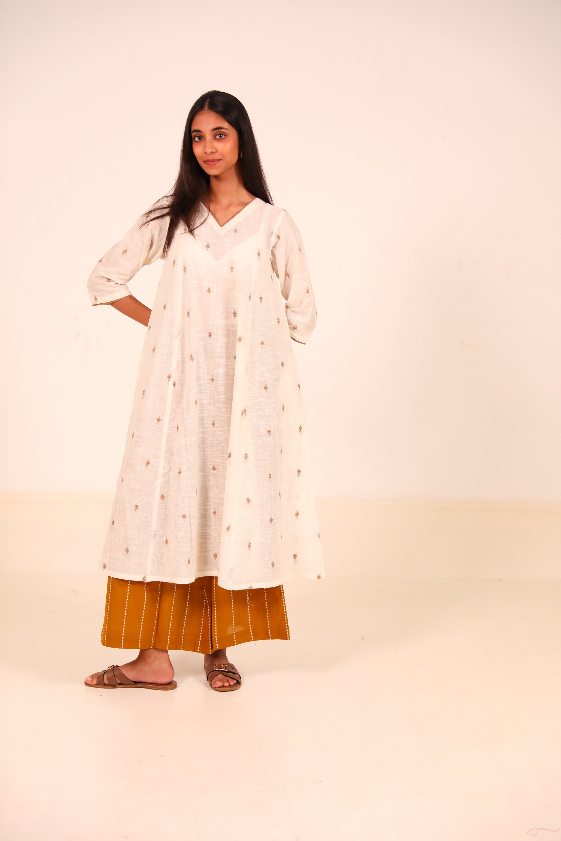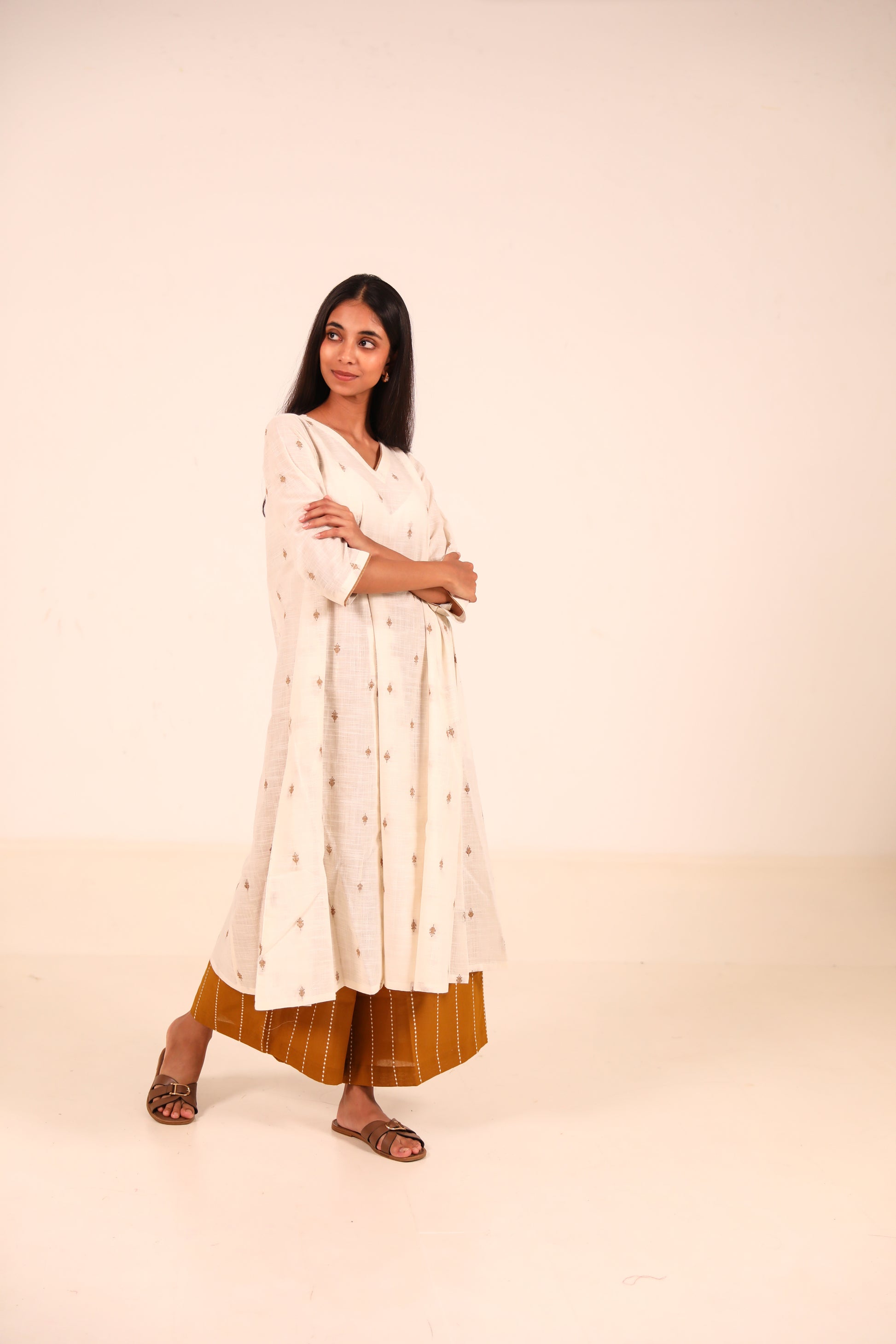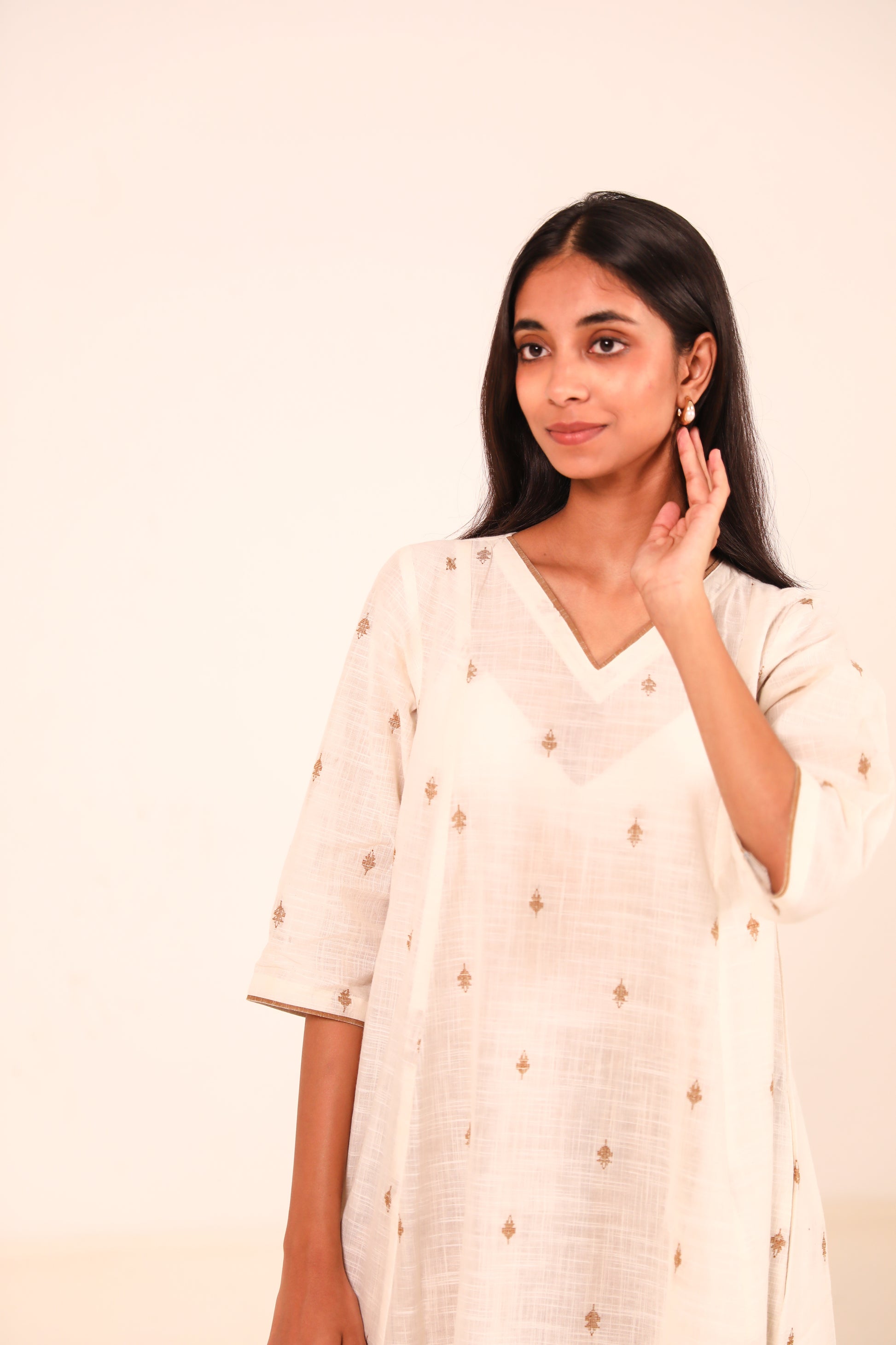 Graceful and understated, the Mother of Pearl kurta set features a flowing silhouette with subtle prints and side pockets. Paired with contrast-tone pants, it brings effortless elegance to your everyday or festive look.