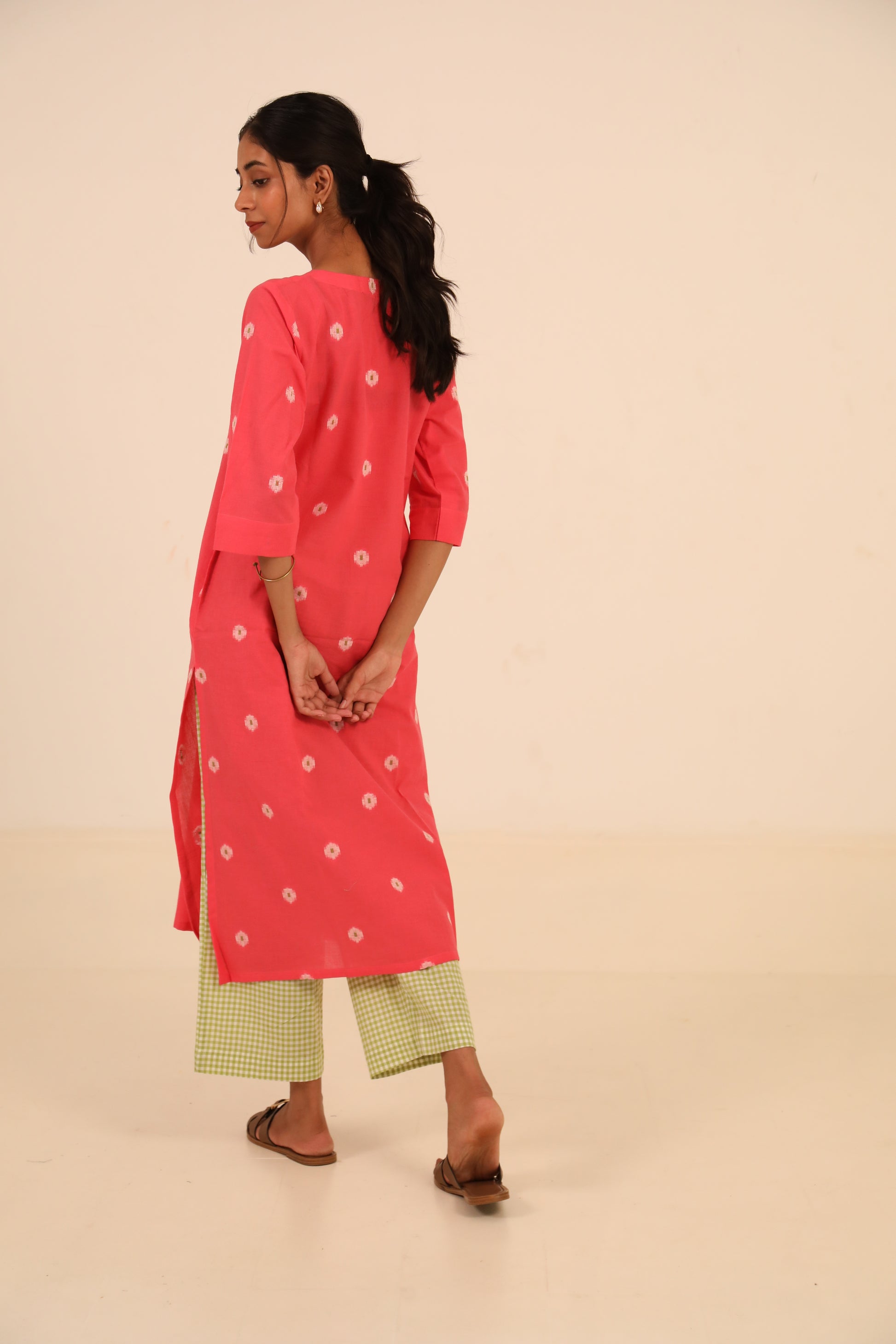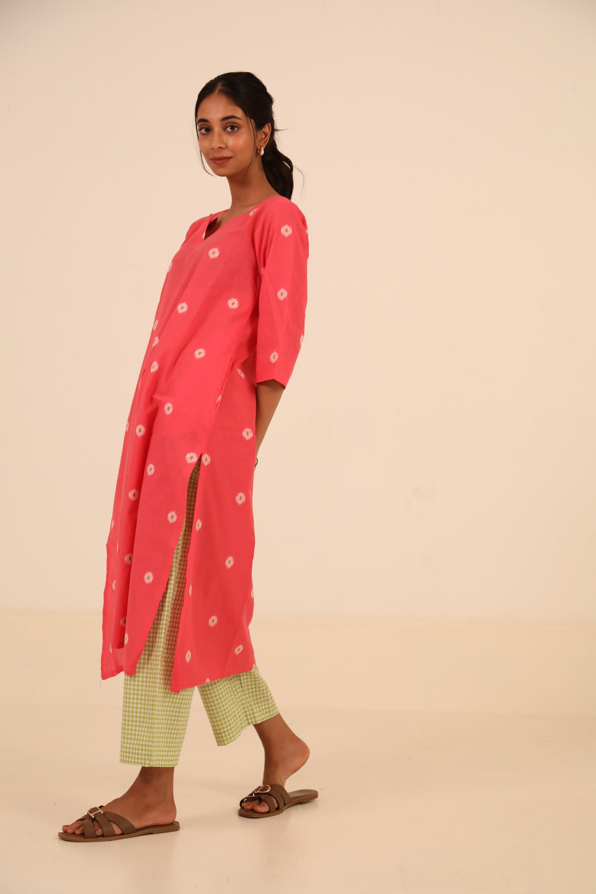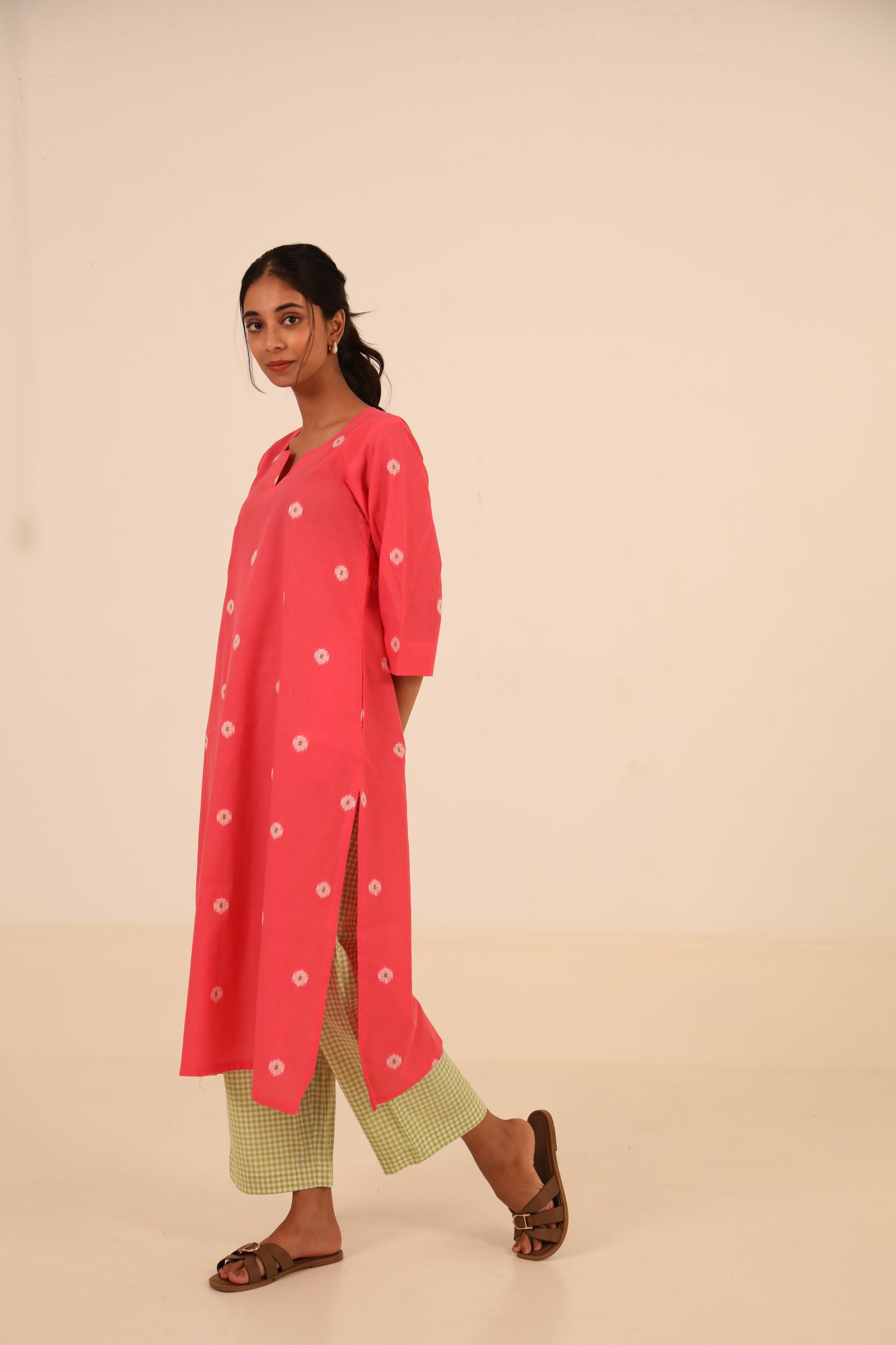 Cheerful and easy-going, this coral pink kurta set is adorned with soft white floral prints and paired with refreshing green gingham pants. A mood-lifting ensemble perfect for days when comfort is key but charm is non-negotiable.