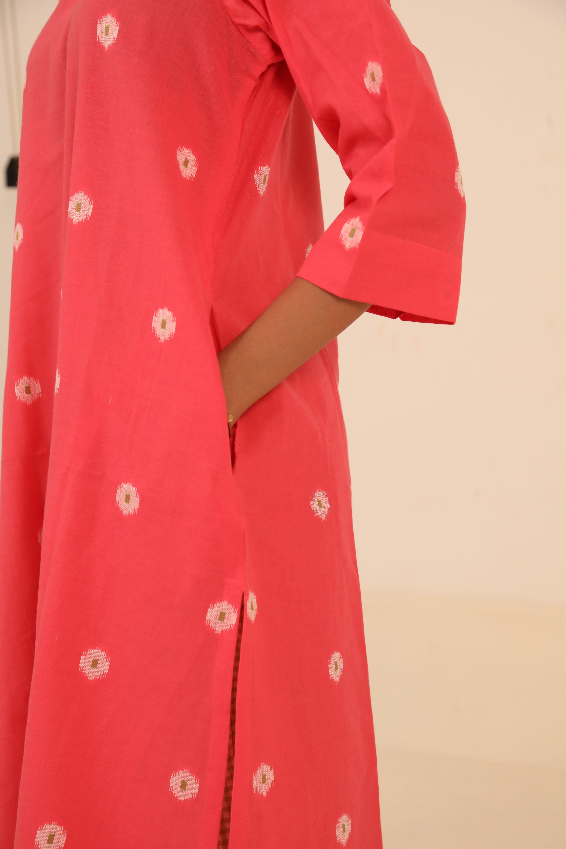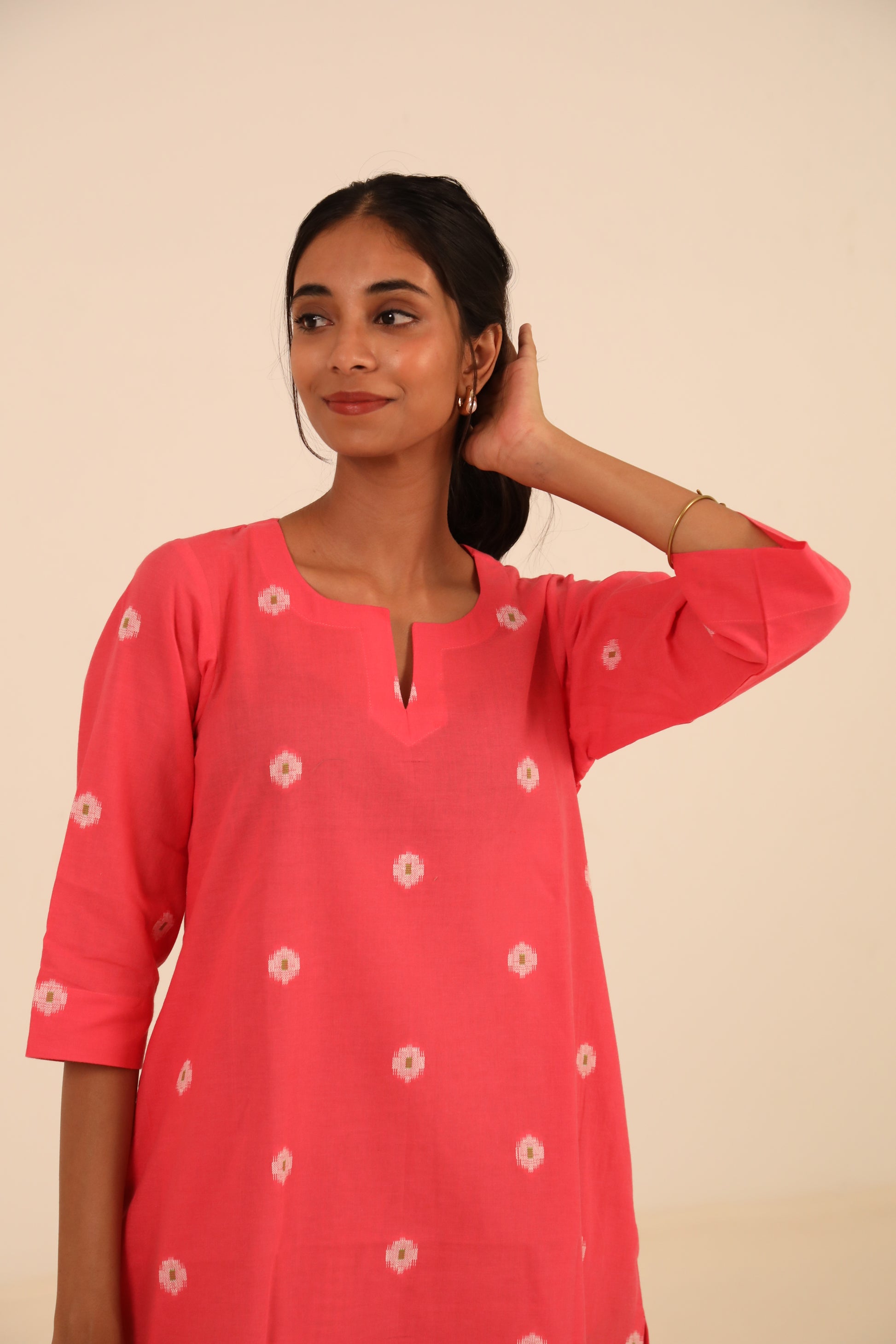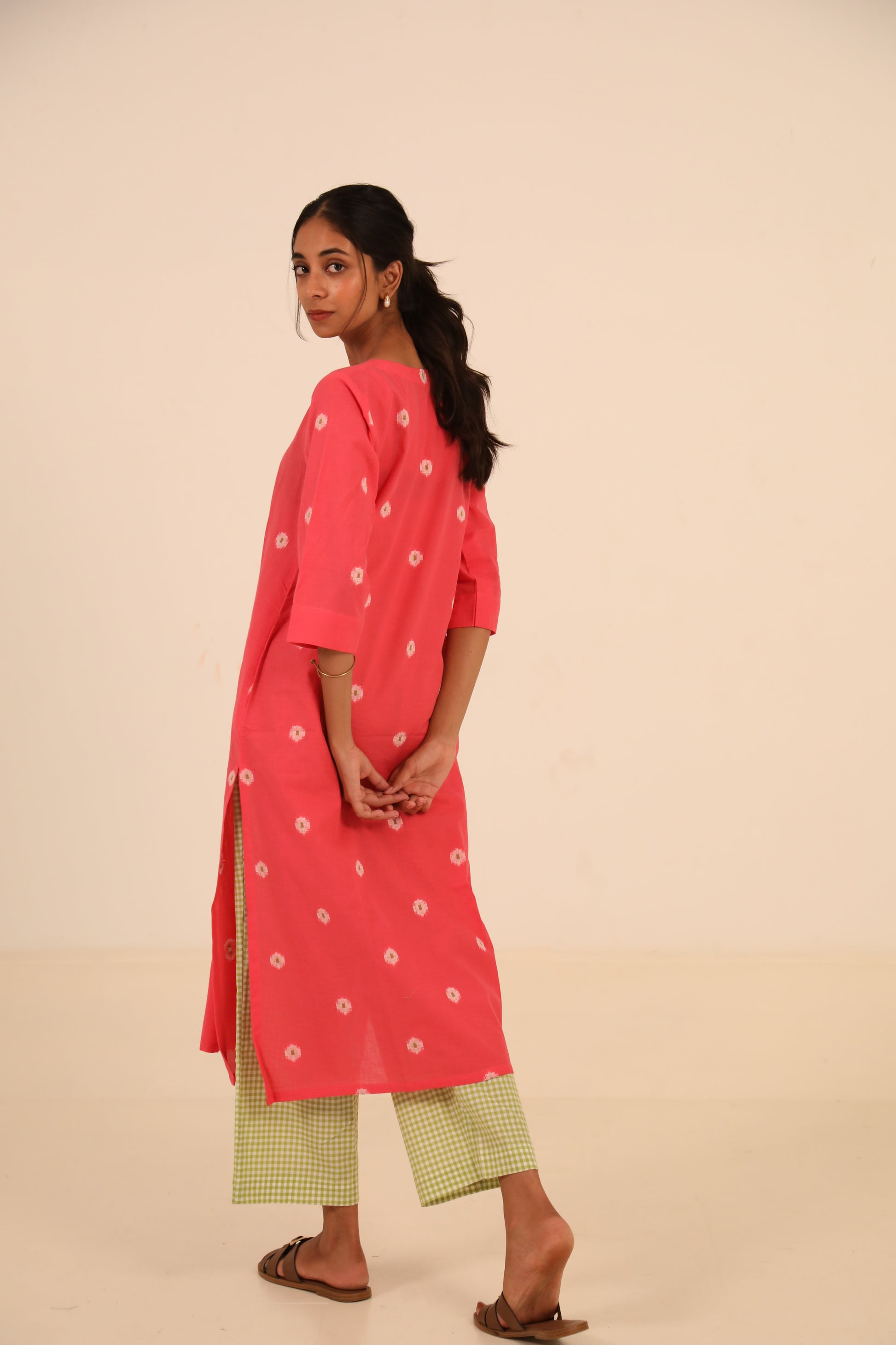 Cheerful and easy-going, this coral pink kurta set is adorned with soft white floral prints and paired with refreshing green gingham pants. A mood-lifting ensemble perfect for days when comfort is key but charm is non-negotiable.