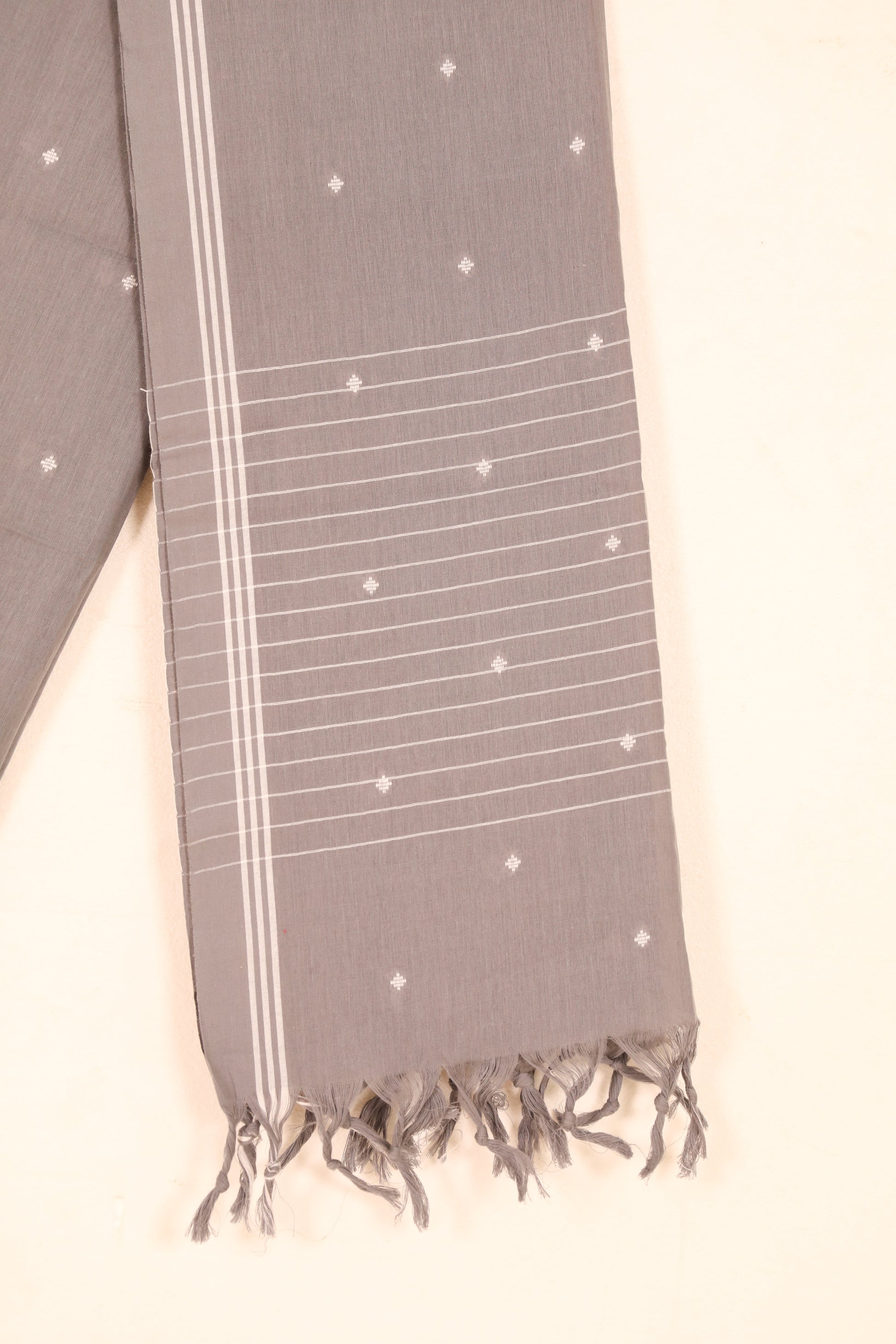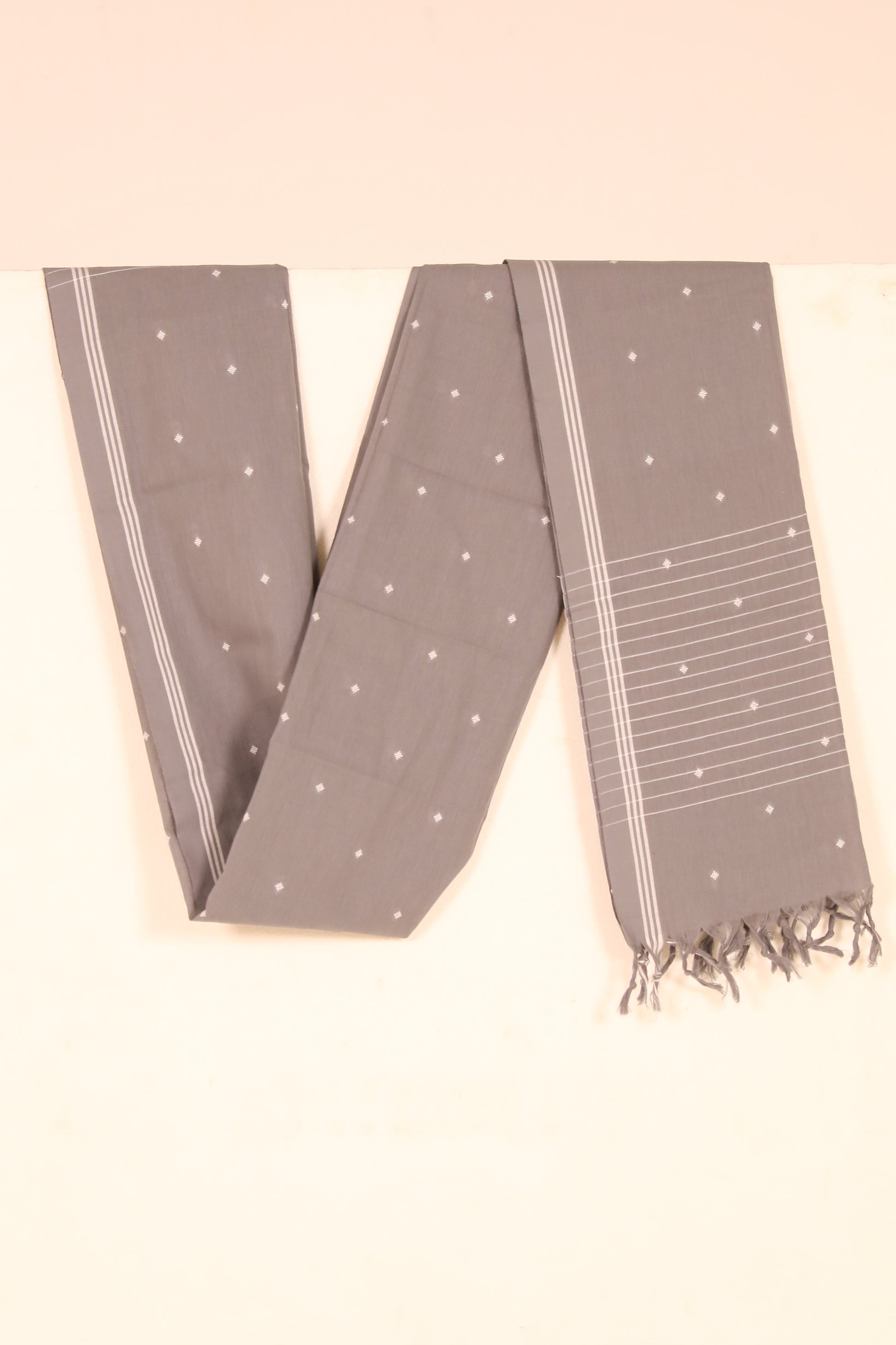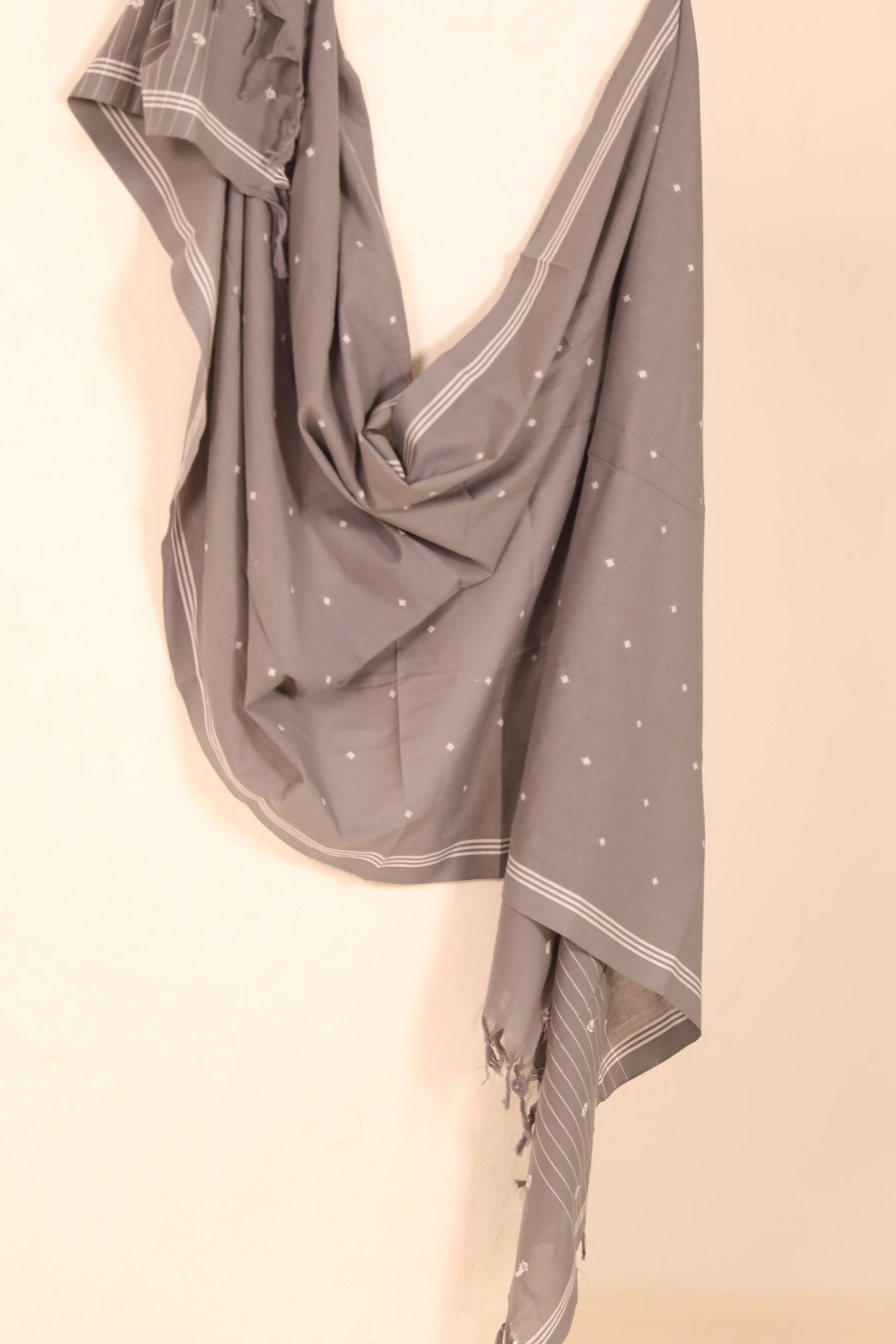 A timeless essential in a calming stone grey, this handwoven cotton dupatta is detailed with subtle white dotted motifs and fine linear patterns. Lightweight and breathable, it layers effortlessly and adds quiet sophistication to any look. Finished with soft tassels for an artisanal touch.