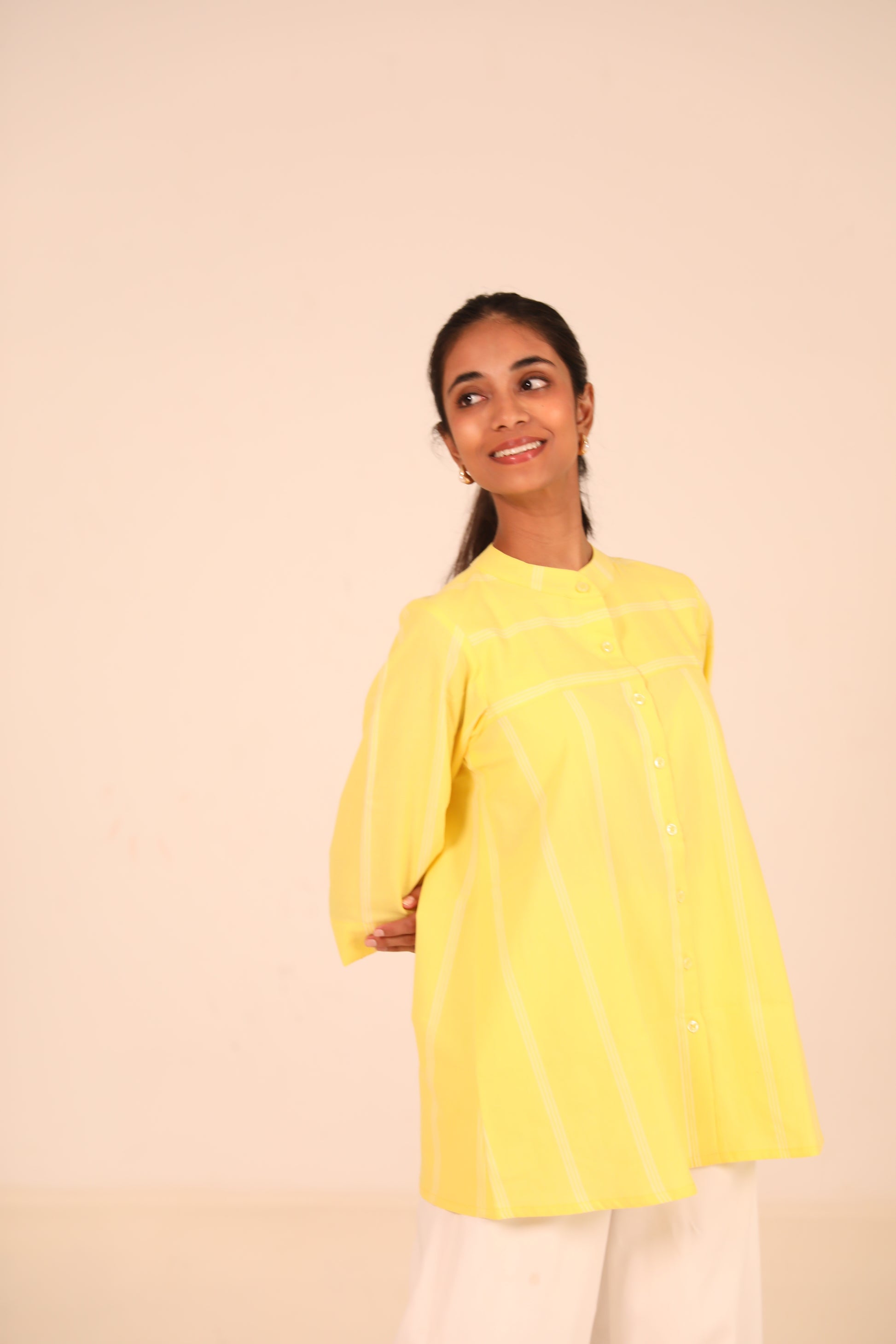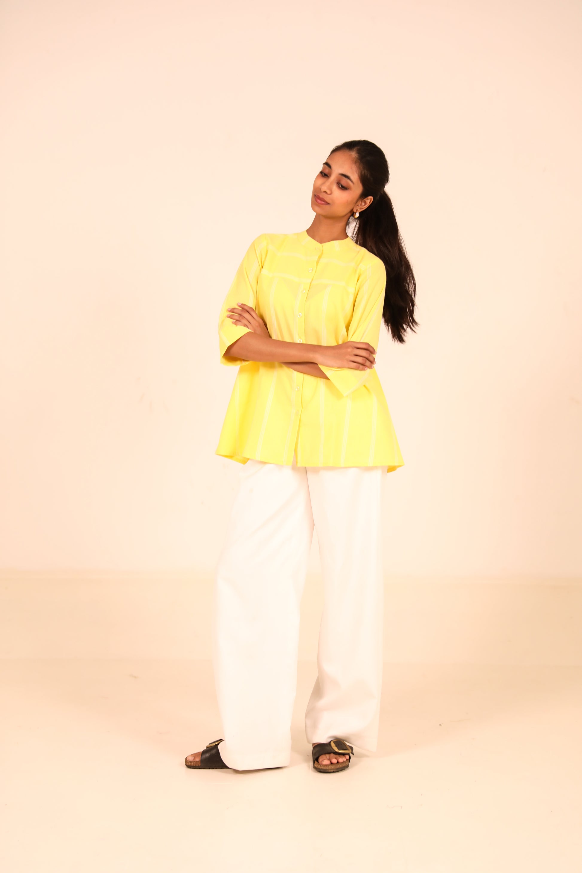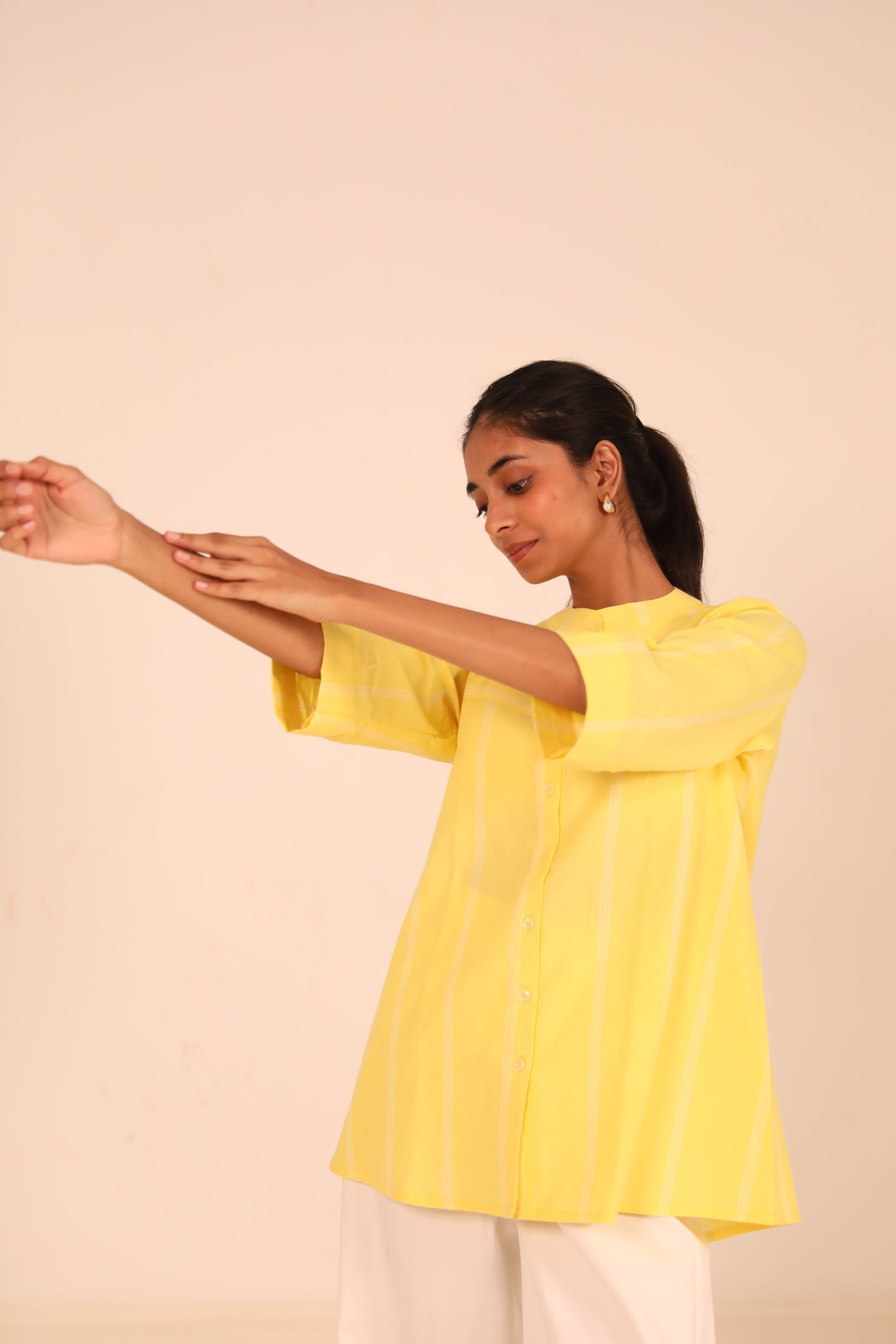 Our Sunlove Top features a flared silhouette with a smart button-down front and three-quarter sleeves. Its relaxed design brings a playful yet elegant touch to your everyday wardrobe, perfect for both casual outings and laid-back days.