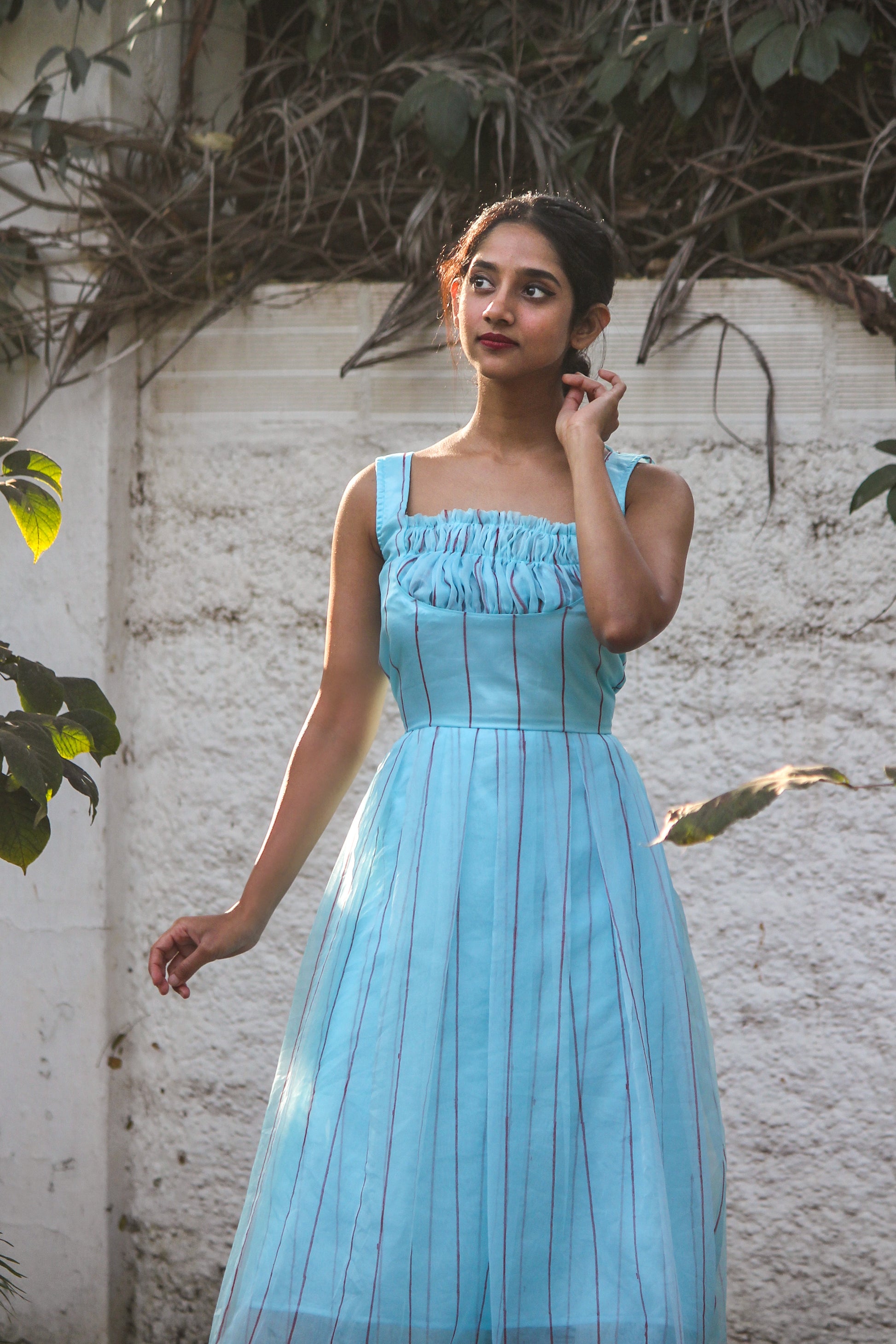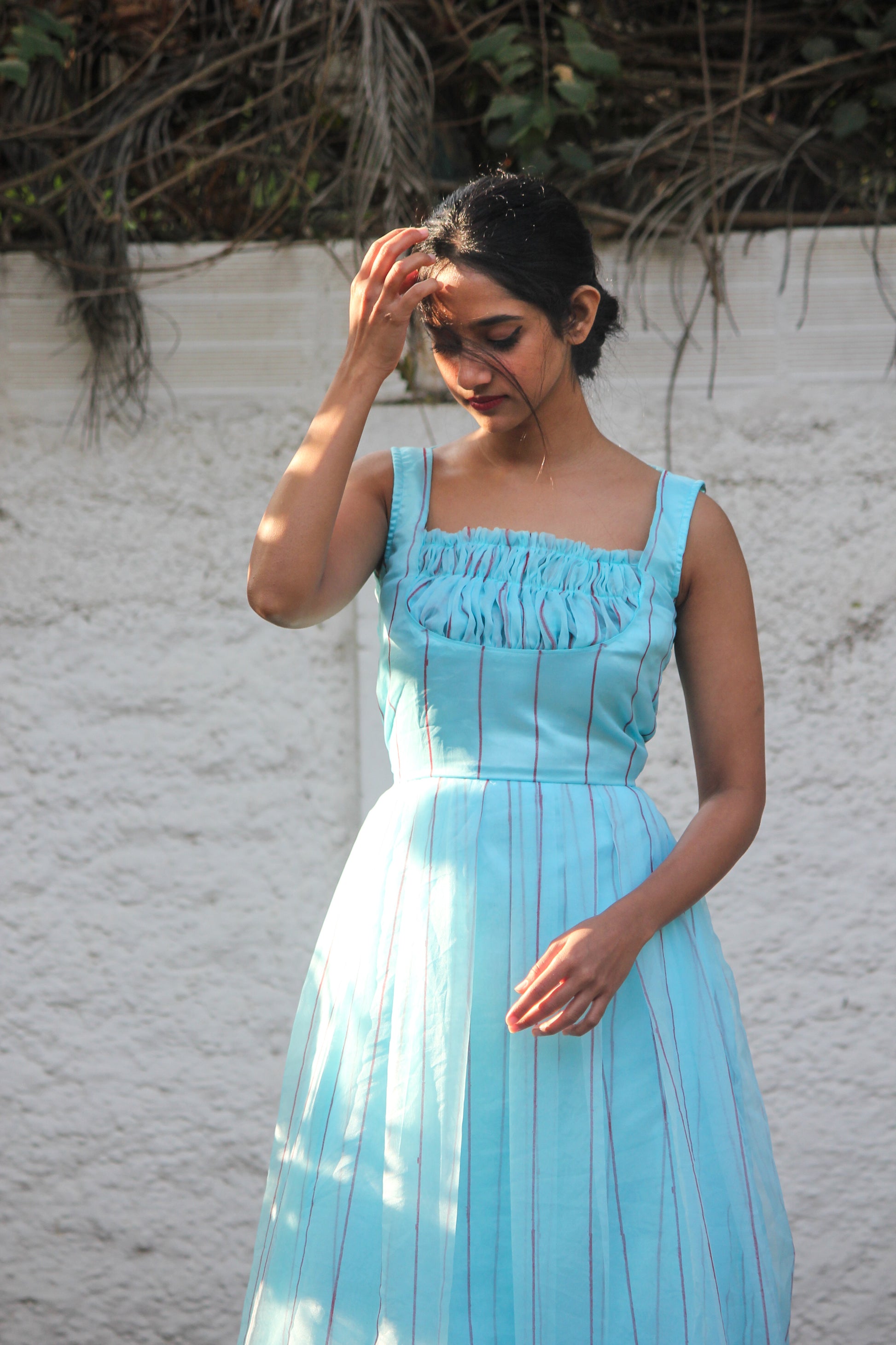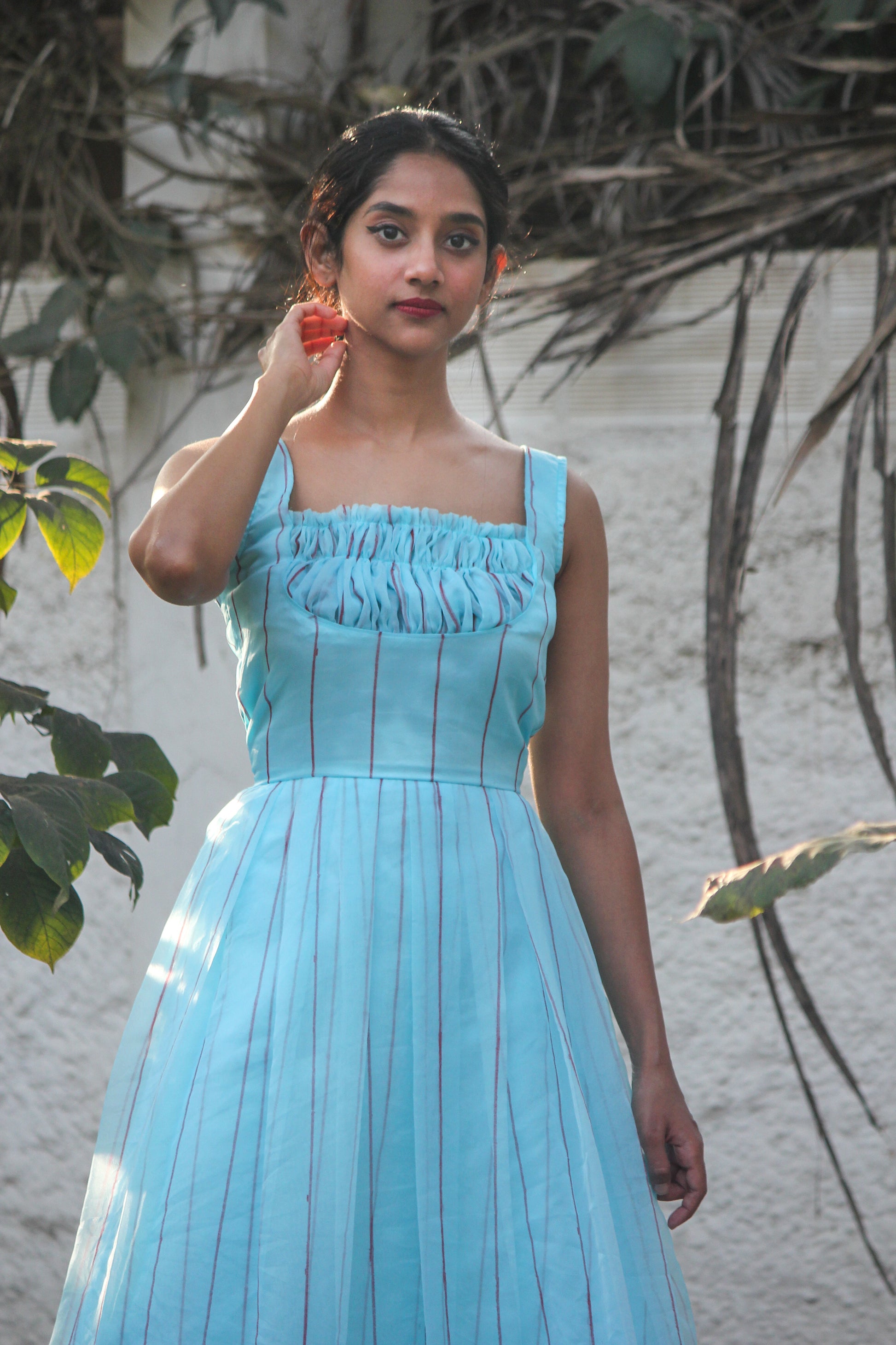 Zoey is an ode to a story of delicate yet strong willed women, who carries her heart on her sleeves and knows nothing but only love. Zoey is carefully crafted in soft shade of sky blue and is accentuated with bright maroon red hand block printed stripes indicating that love is both delicate and strong, weakness and strength, fear and courage and love has all shades of emotions barring who you are as a person and is life.