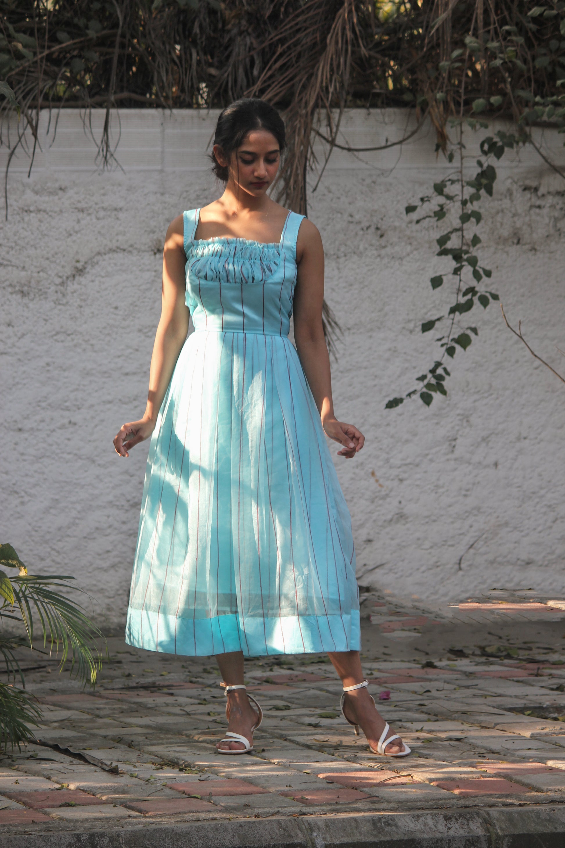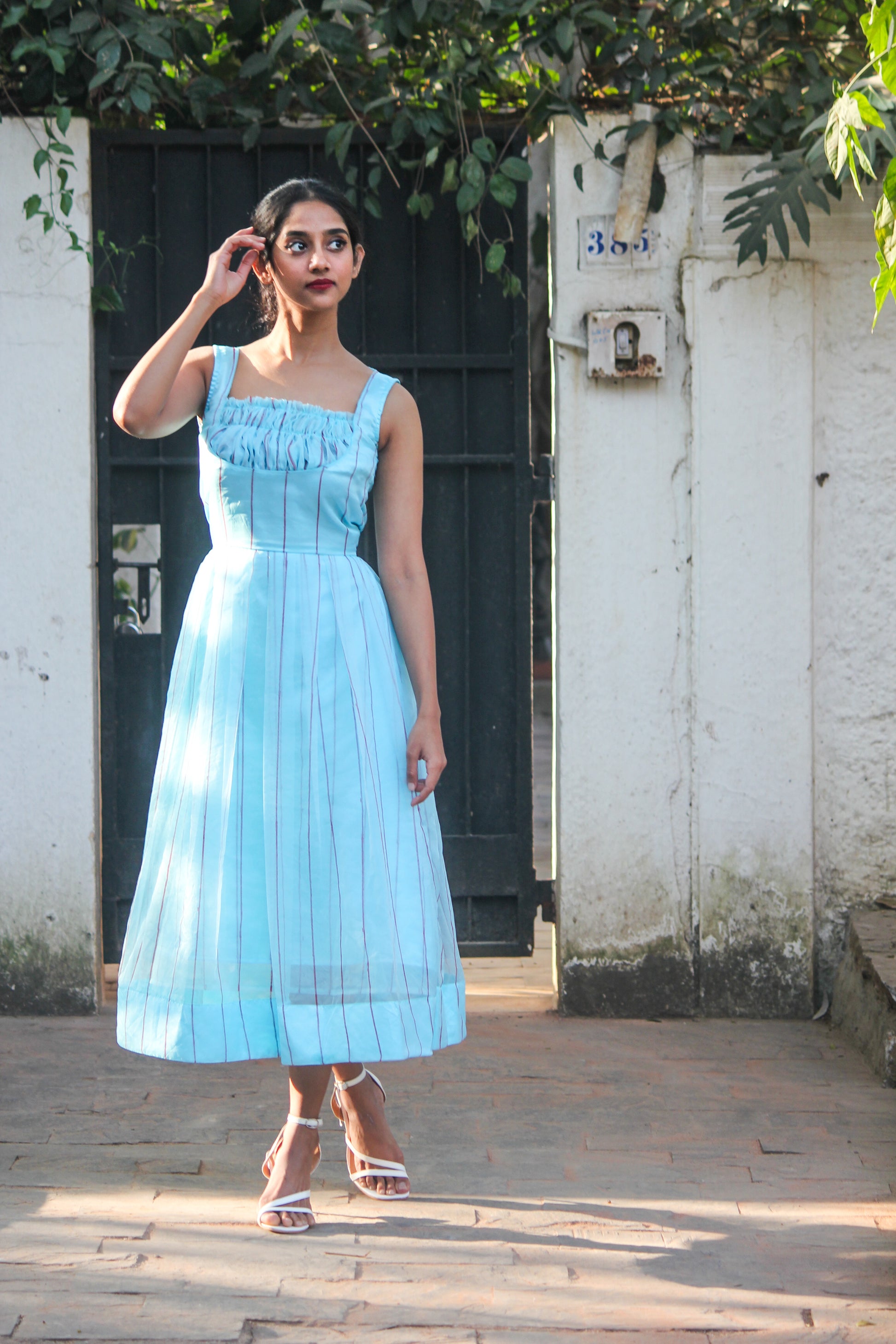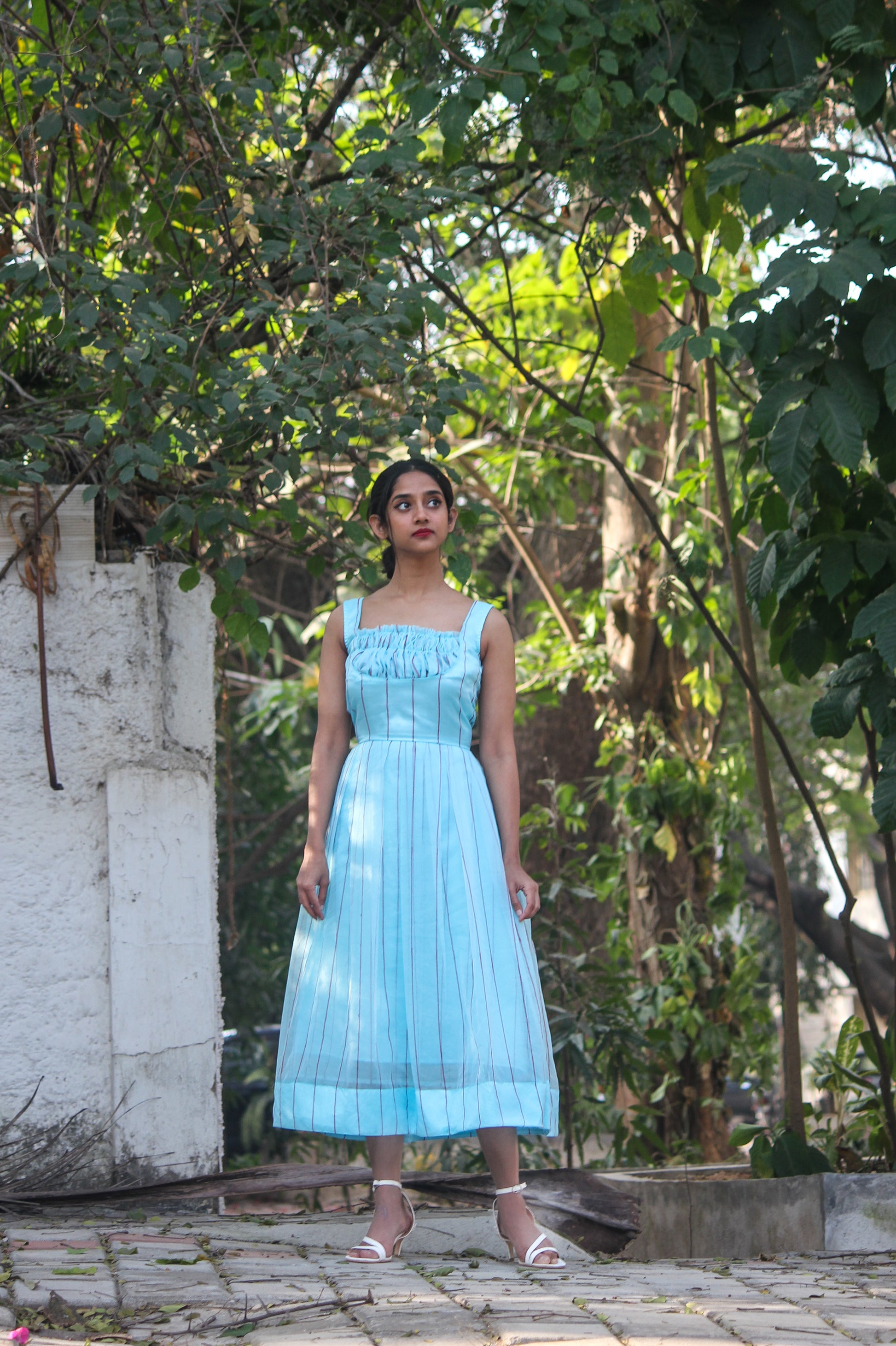Zoey is an ode to a story of delicate yet strong willed women, who carries her heart on her sleeves and knows nothing but only love. Zoey is carefully crafted in soft shade of sky blue and is accentuated with bright maroon red hand block printed stripes indicating that love is both delicate and strong, weakness and strength, fear and courage and love has all shades of emotions barring who you are as a person and is life.
